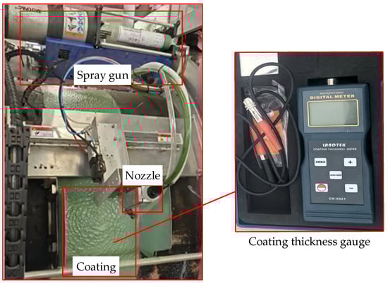 The effects of the nozzle to surface distance and the nozzle travel speed on the primer coating thickness were systematically investigated under constant air supply pressure. Specifically, experiments were conducted with nozzle heights of 200 mm, 225 mm, 250 mm, 275 mm, 300 mm, 325 mm, 350 mm, 375 mm, and 400 mm. For each height, the nozzle travel speeds were set to 40 mm/s, 50 mm/s, 60 mm/s, 70 mm/s, 80 mm/s, 90 mm/s, 100 mm/s, 110 mm/s, and 120 mm/s. The resulting coating thicknesses were measured using a calibrated coating thickness gauge to evaluate the influence of these parameters on film formation quality. The experimental device is shown in Figure 26.