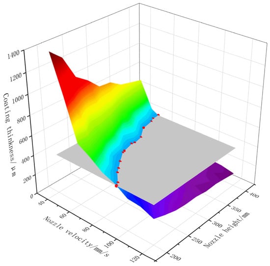The experimental results are presented in Figure 27, where the colored surface represents the coating thickness corresponding to various nozzle travel speeds and nozzle to surface distances. The gray plane denotes the required coating thickness of 400 μm, and the intersection line between the two surfaces defines the critical boundary for the minimum acceptable coating thickness. As the nozzle distance increases, the spray dispersion becomes more pronounced, resulting in reduced deposition density and consequently thinner coatings. Similarly, higher nozzle speeds decrease the local residence time of the spray, further reducing coating thickness and intensifying the thickness gradient. This combined effect produces a nonlinear response surface, where coating thickness decreases sharply with increasing speed and distance. These experimental findings provide valuable guidance for parameter selection in primer spraying operations. To ensure both sufficient coating thickness and high spraying efficiency, the optimal parameter combinations should be chosen above and close to the intersection line.