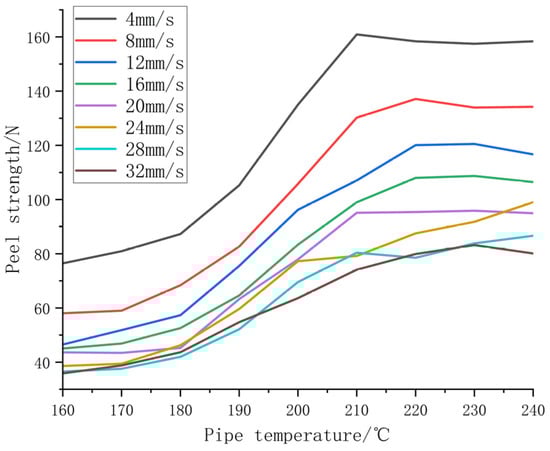 The influence of rolling speed and pipe temperature on peeling strength.