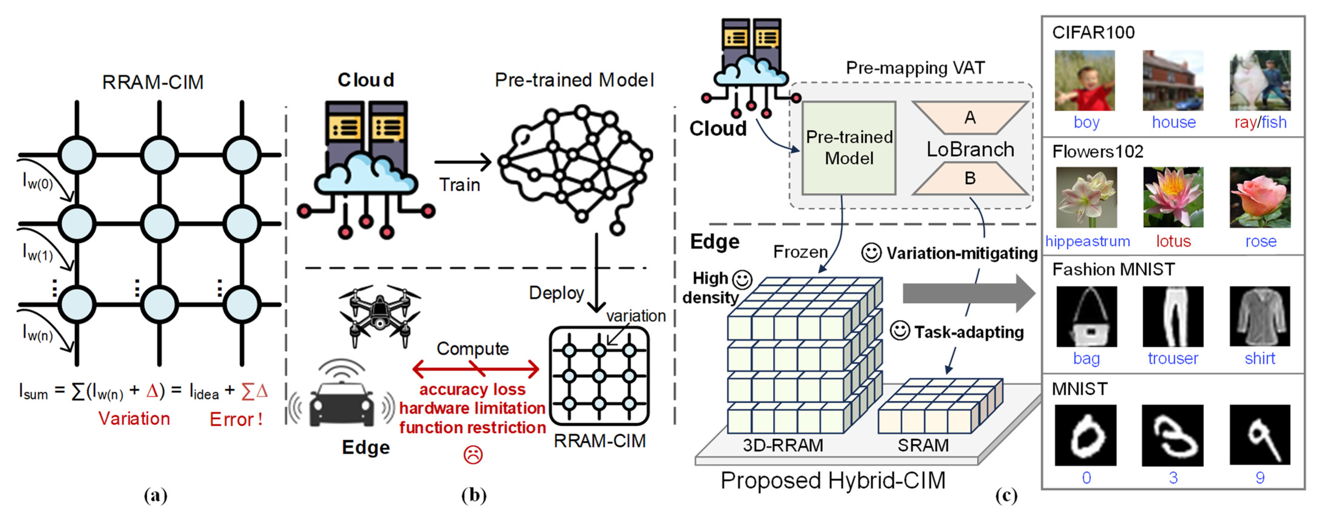 - Hybrid-CIM Hardware Mapping: The robust model is then deployed onto the system-level Hybrid-CIM architecture. The pre-trained main weights (W) are mapped to the variation-prone 3D-RRAM macro, while the low-rank LoBranch parameters (A, B) are mapped to the precise SRAM-CIM macro.