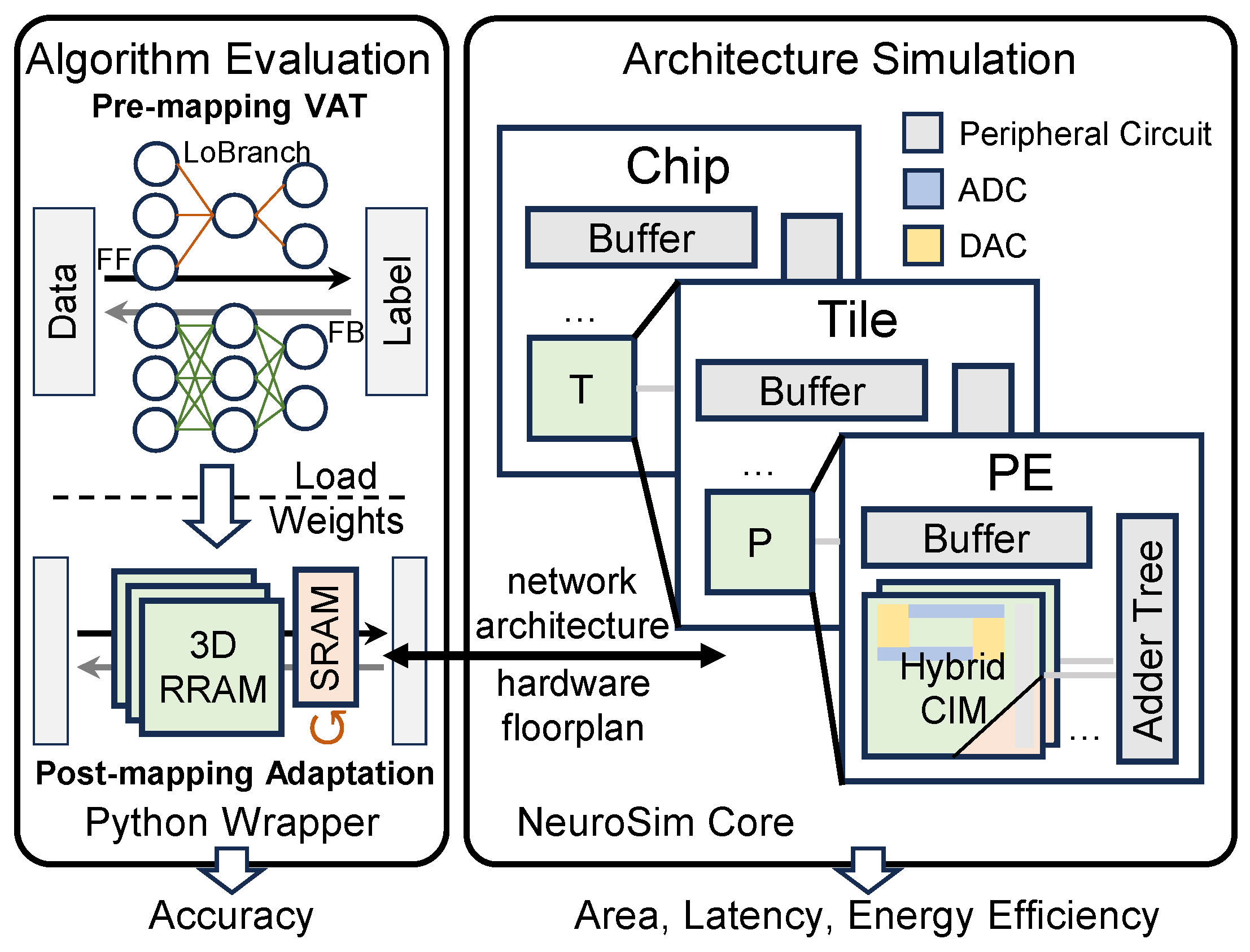 - System-Level Performance Evaluation: The final performance of the adapted model is evaluated using a simulation framework calibrated for CIM architectures. This evaluation provides credible estimates for metrics such as accuracy, energy efficiency, latency, and area overhead, representing the optimized system’s capability.