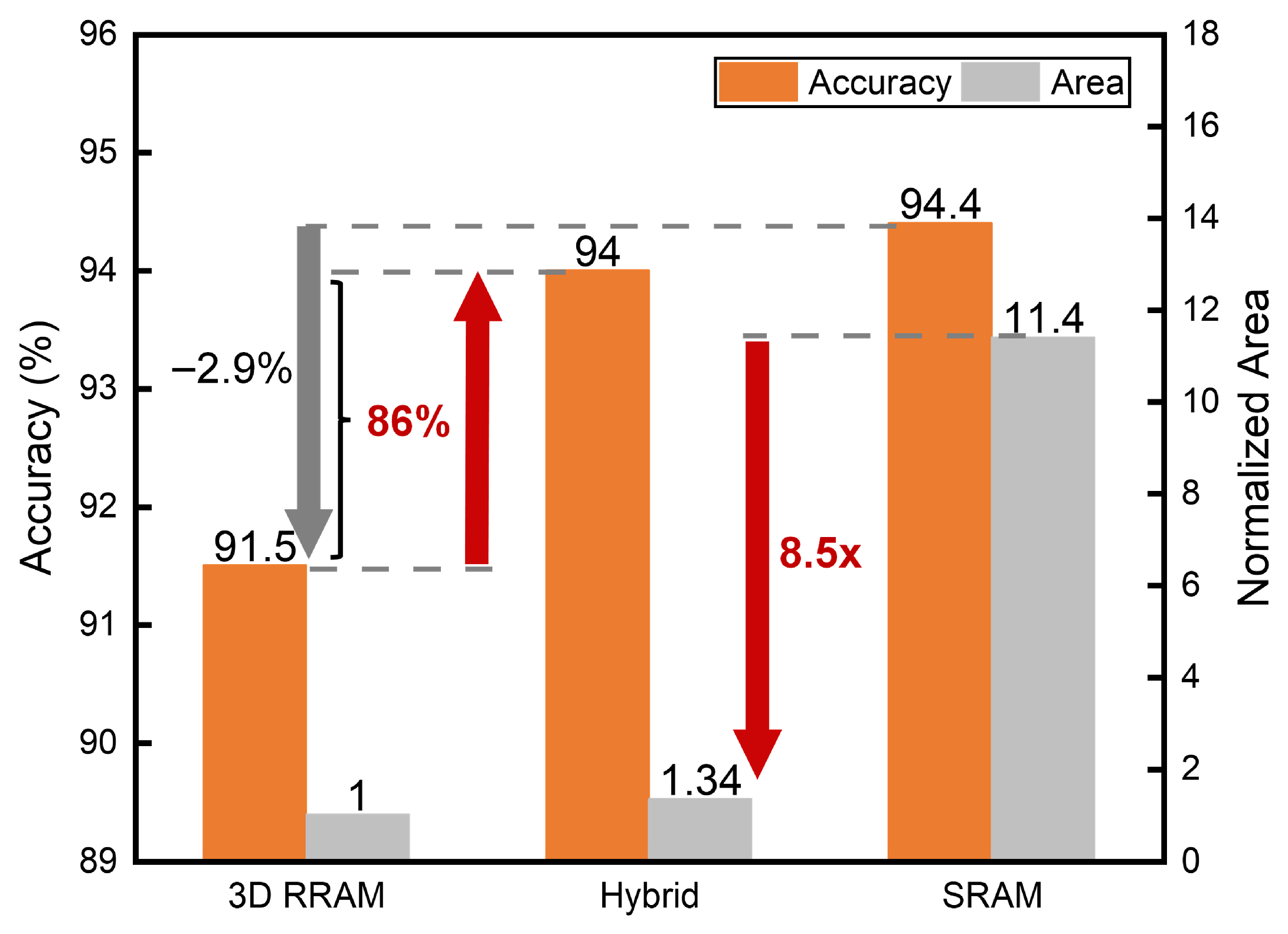 | Ours | 8-bit | 3D RRAM and 2% SRAM | yes | high | yes | 94.0 |