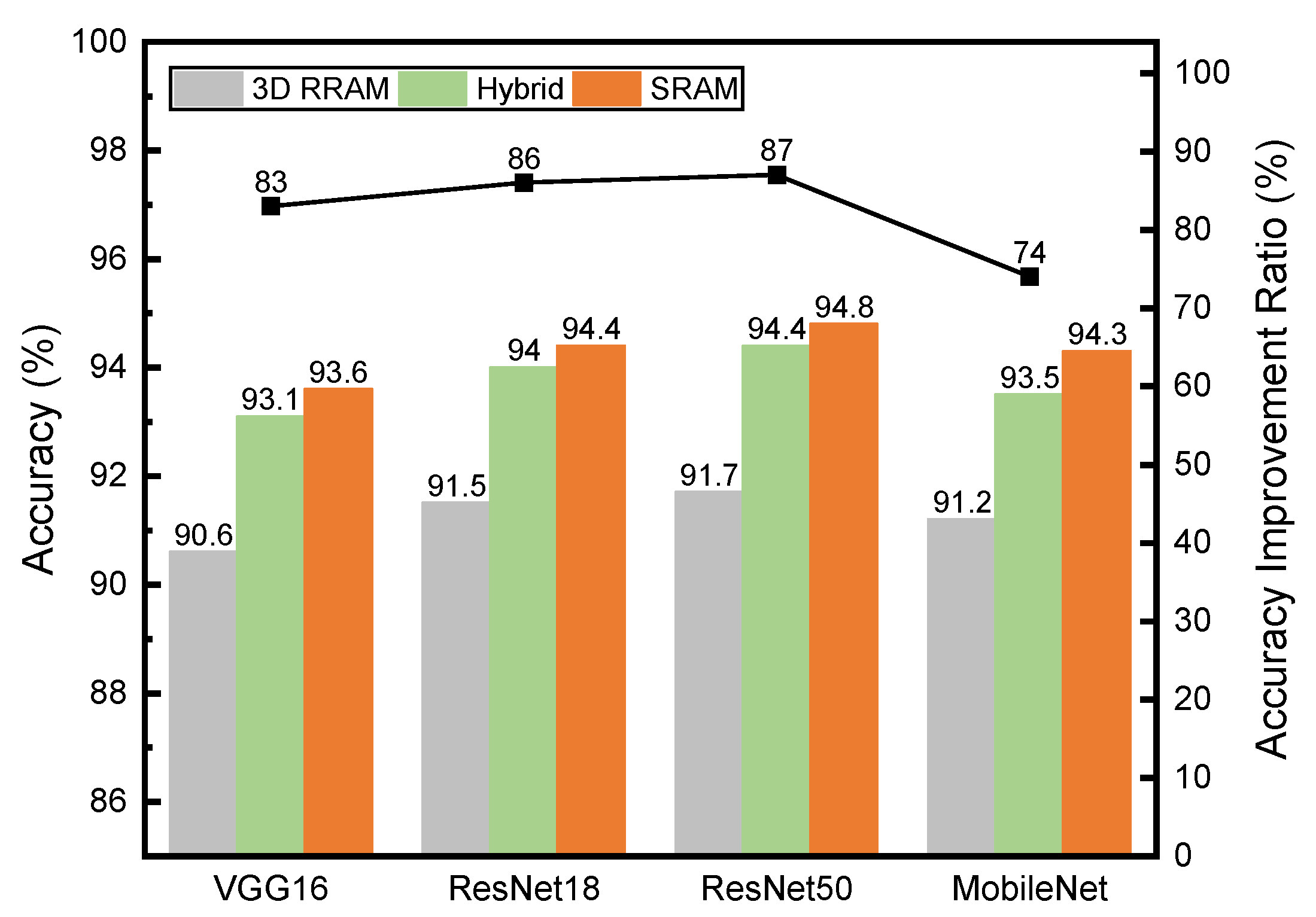 | Ours | 8-bit | 3D RRAM and 2% SRAM | yes | high | yes | 93.14 |