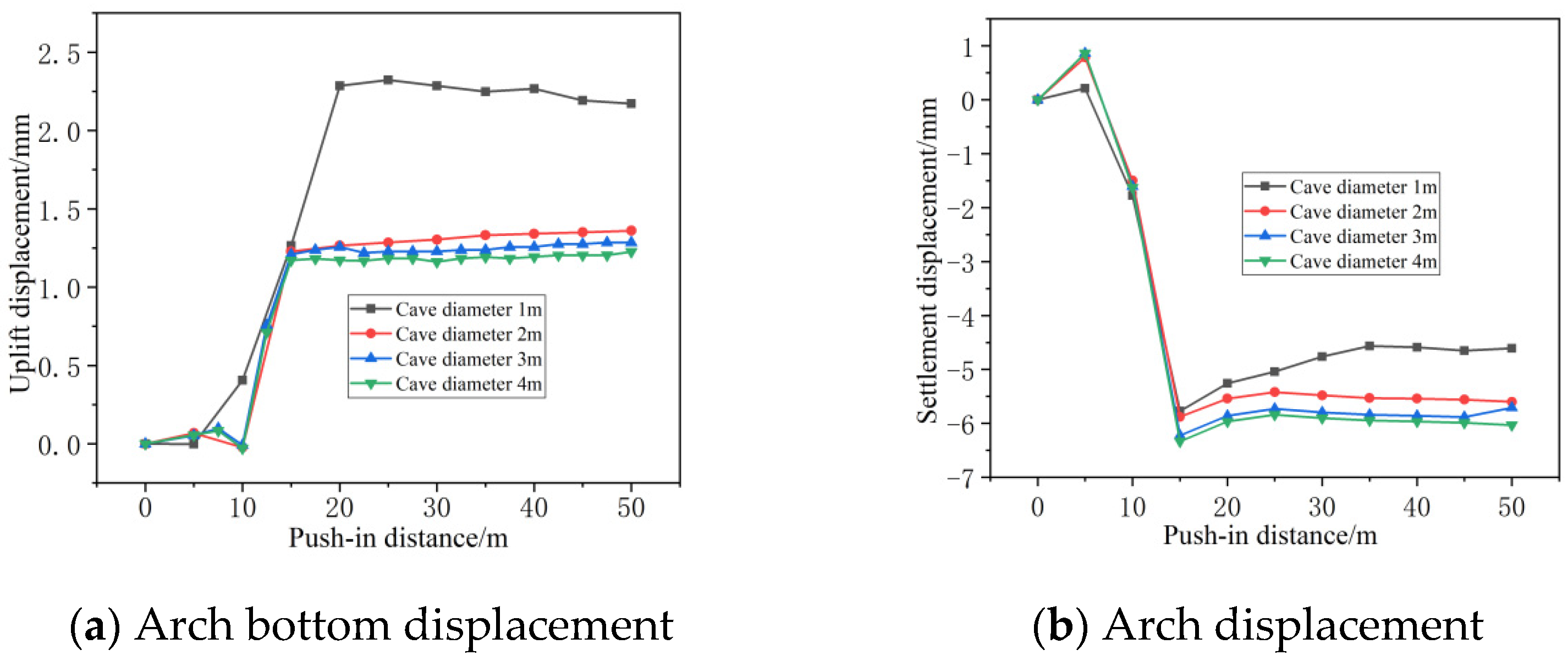 4.1.2. Effect of Karst Cavity Size on Tunnel-Surrounding Rock Displacement