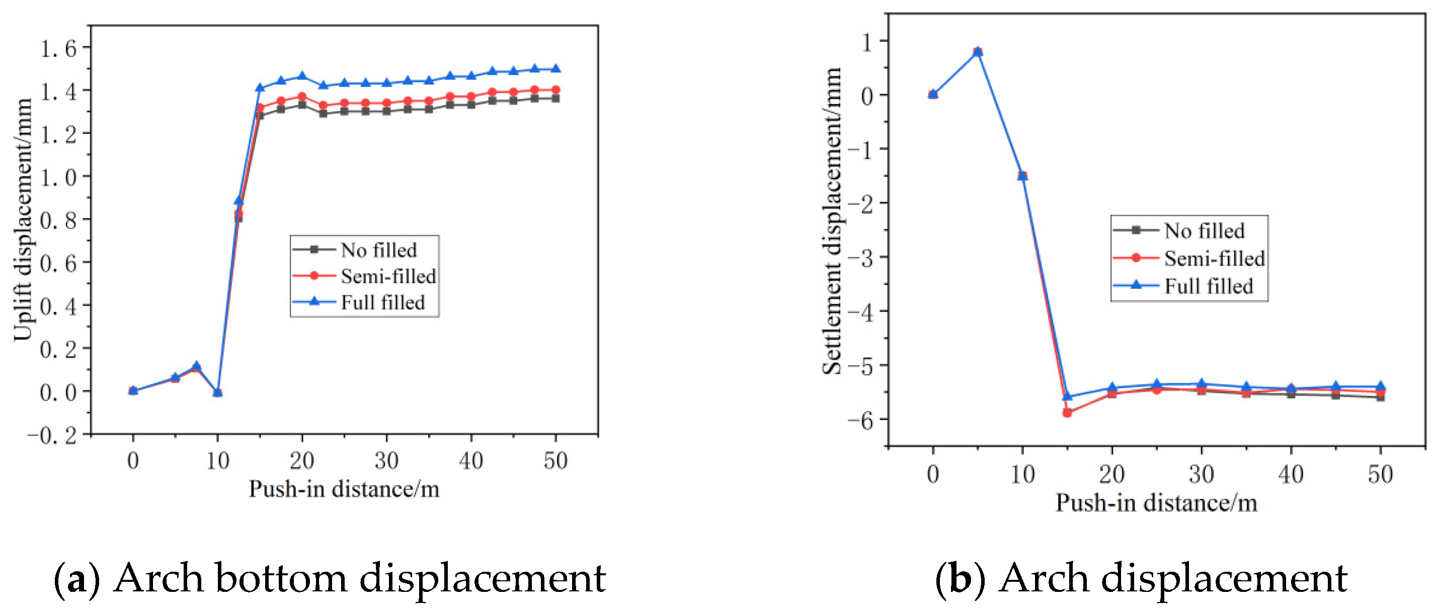4.1.3. Influence of Backfill Condition on Tunnel Surrounding Rock Displacement
