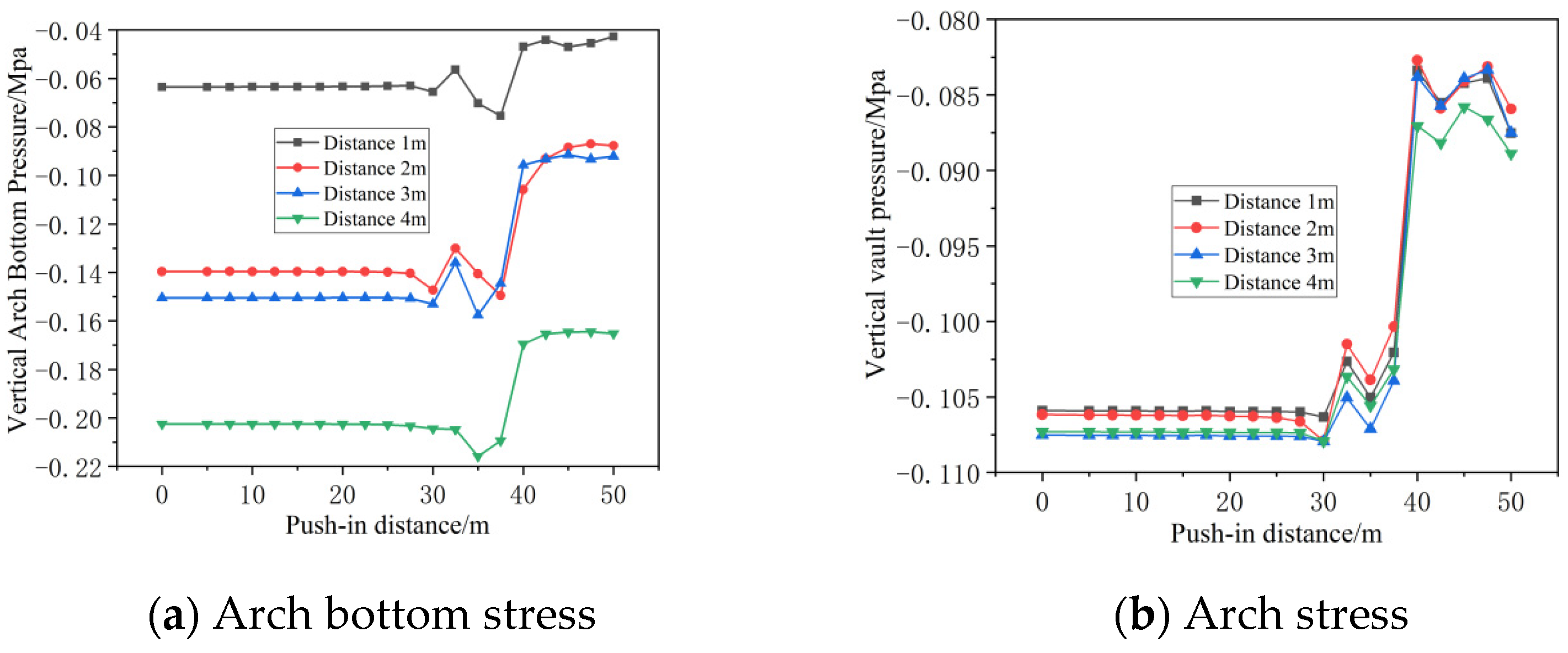 4.2.4. Effect of Spacing Between Karst Cavities and Tunnels on Surrounding Rock Stress
