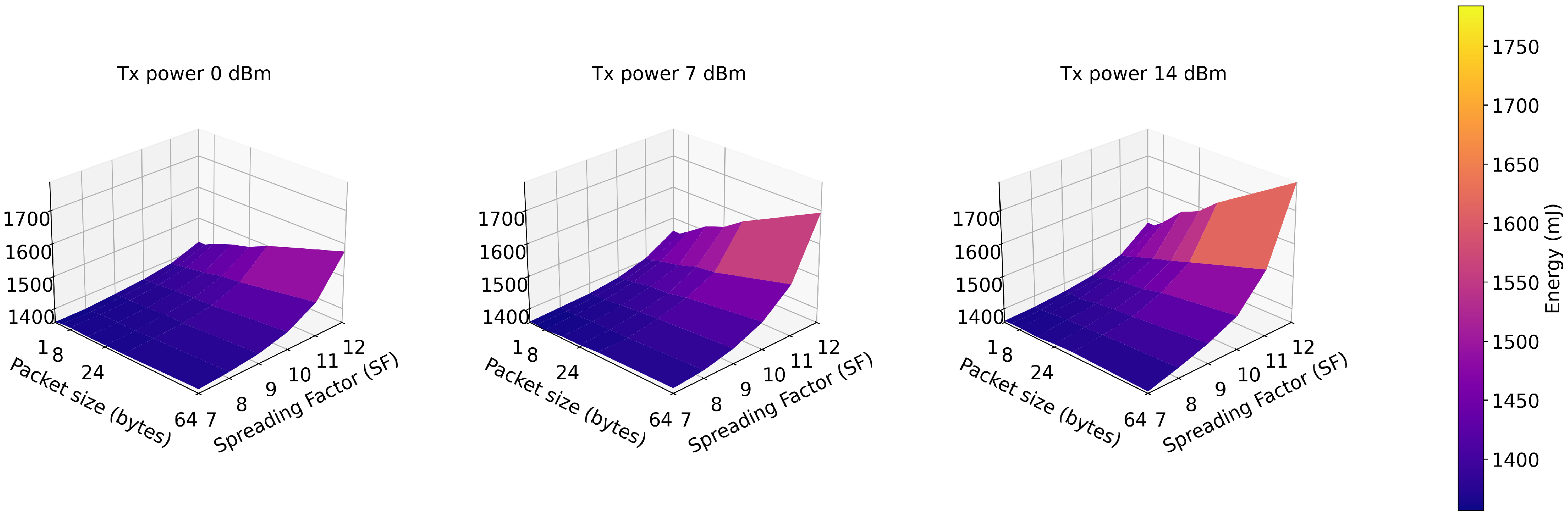 The selection of communication parameters, such as SF, payload size, and transmission power, has a direct impact on the node’s energy consumption, as shown in Figure 1, and also affects the packet delivery rate [21,22,23]. The 3D surface plot in Figure 1 illustrates the joint impact of payload size and spreading factor on energy consumption at different transmission power levels (0, 7, and 14 dBm). As expected, energy consumption increases with both larger payloads and higher spreading factors due to the longer time on air. Additionally, higher transmission power levels drive an overall increase in energy use. This visualization clearly highlights the trade-offs involved: to minimize energy consumption, smaller payloads and lower spreading factors are preferable.
