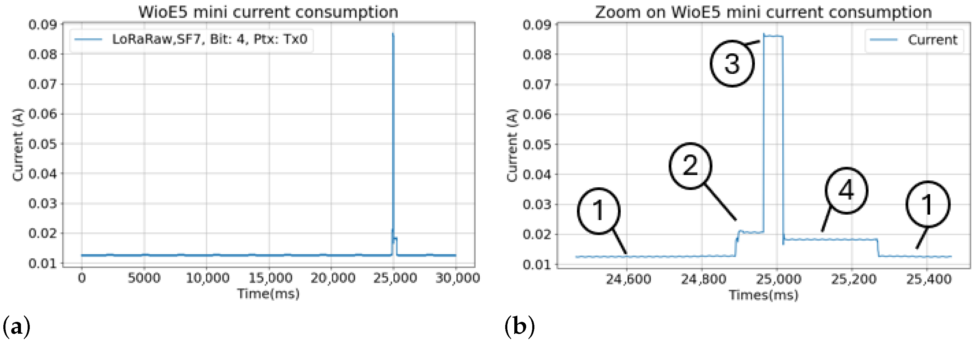Figure 2a shows that, over the entire data transmission cycle, the instruction wait phase lasts significantly longer than the actual transmission phase. However, the current drawn during transmission is much higher than the current consumed during instruction waiting. Figure 2b provides a detailed view of the peak current consumption associated with message transmission. Four distinct phases can be observed: