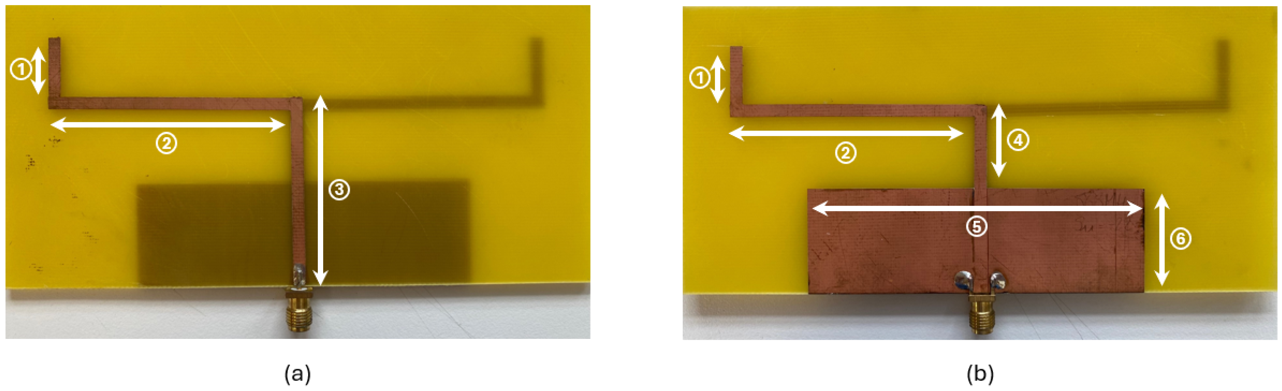 Figure 5 presents the simulated and measured reflection coefficient ( S 11 ) of the antenna. The S 11 characterization of the antennas was performed using a National Instruments (Austin, TX, USA) PXIe-5630 vector network analyzer (10 MHz–6 GHz), whose high dynamic range (>100 dB), kit-based calibration, and SMA 50 Ω connectors ensure precise, sensitive, and repeatable reflection and transmission measurements [25].