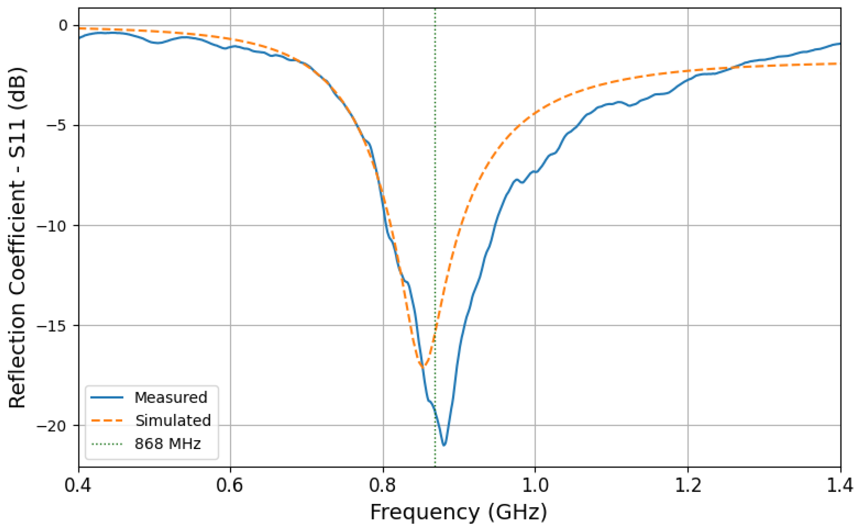The measurement results confirm that the dipole is resonant at 868 MHz with a reflection coefficient of −19 dB and a bandwidth of approximately 100 MHz (defined for S 11 −10 dB). The simulated maximal gain is near 2.15 dBi.