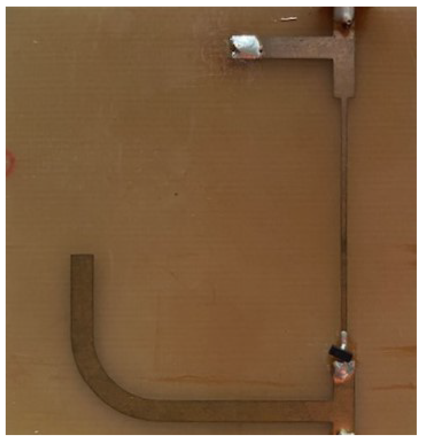 The rectifier was optimized to operate at 868 MHz with a low input power level of P in = 0 dBm. It was composed of a Schottky diode (SMS7630) connected in series with a matching circuit and followed by a DC filter. The entire structure was implemented using microstrip technology on an FR4 epoxy substrate, as shown in Figure 6.