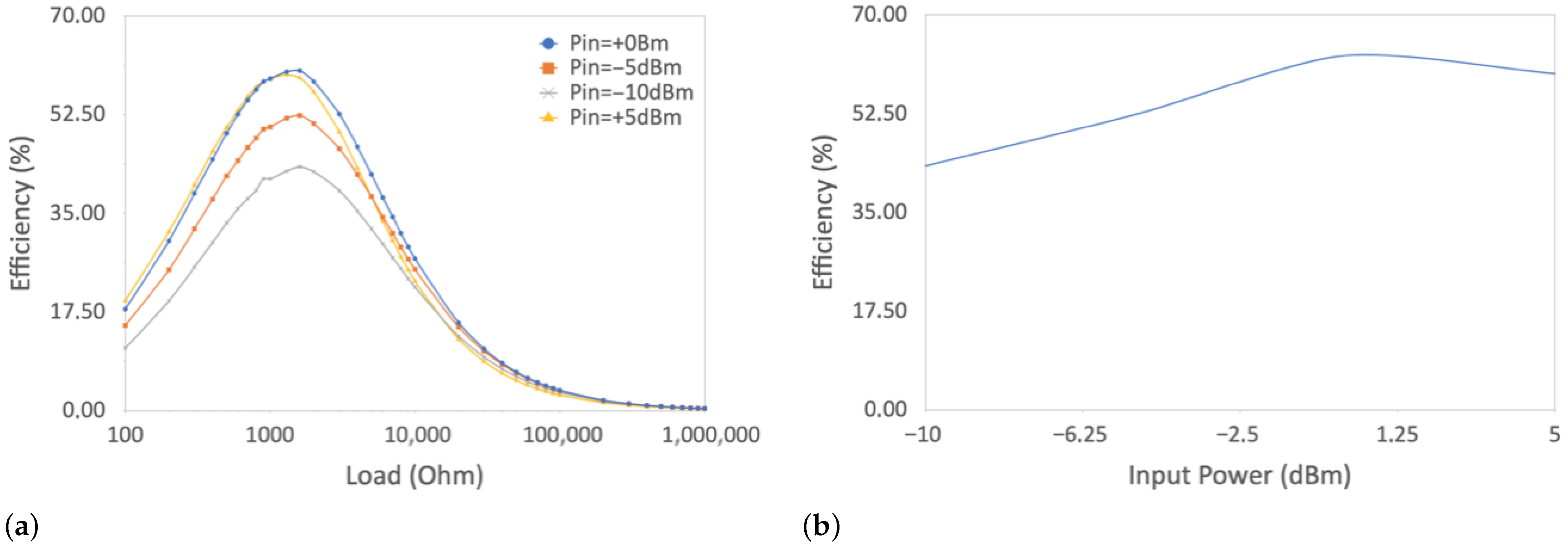 The rectifier efficiency was evaluated under varying load conditions and different input power levels. The experimental results are shown in Figure 8: (a) the efficiency as a function of load resistance, and (b) the maximum efficiency achieved as a function of input power. A peak efficiency of 62.81% was obtained at an input power of 0 dBm and a load resistance of 1600 Ω , which conforms to the operating point chosen for the impedance matching design.