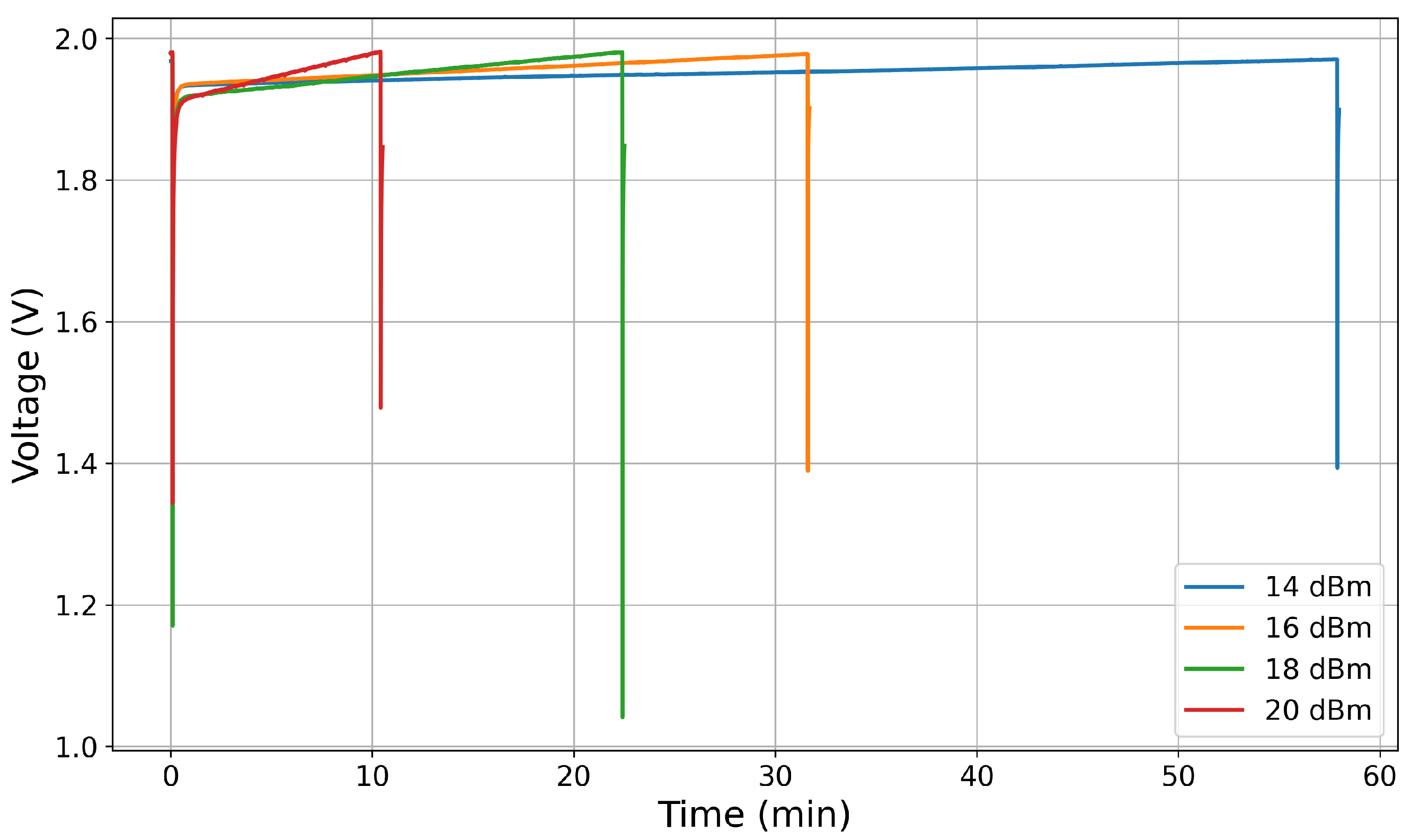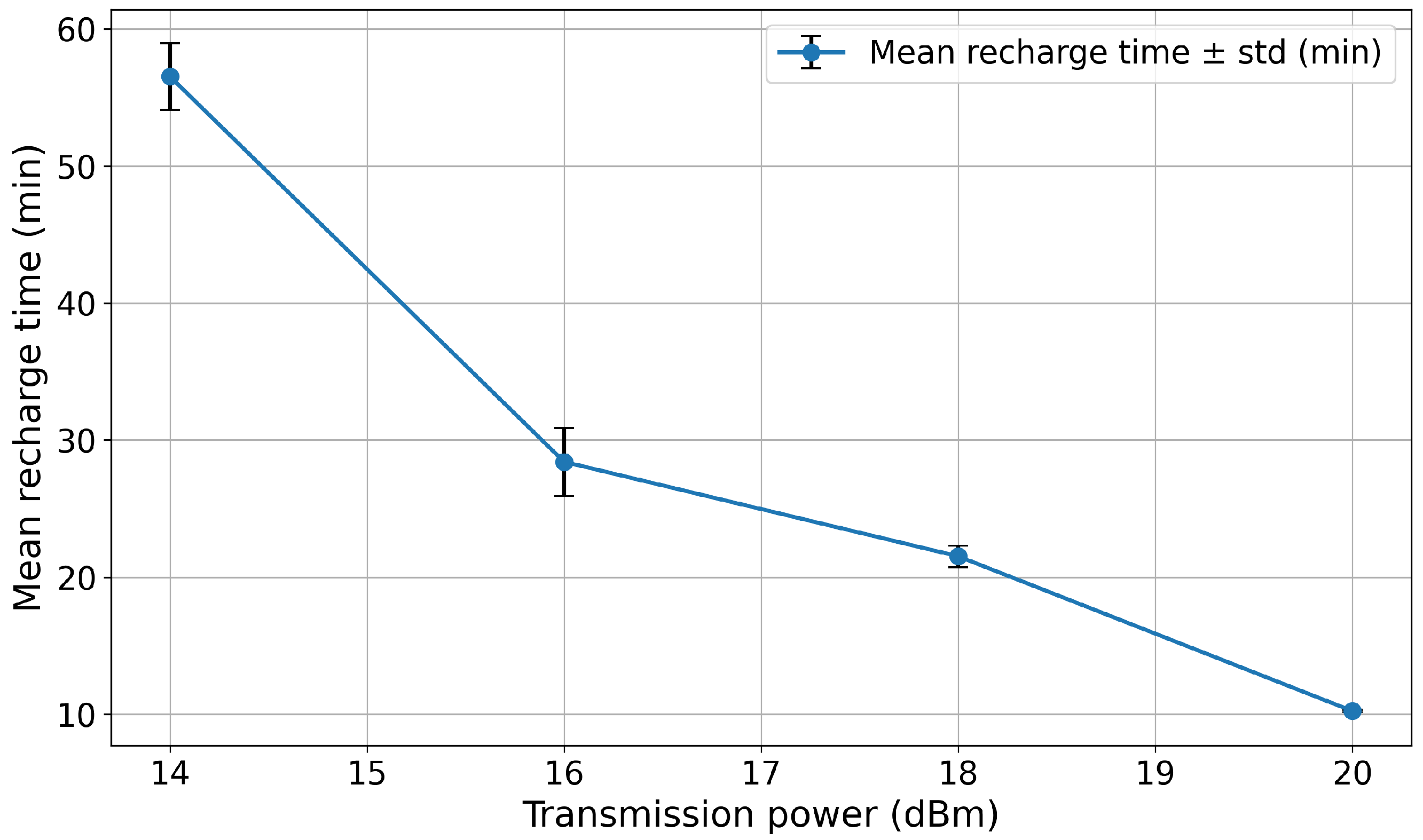 However, on the 868 MHz ISM band, regulatory power is limited to +14 dBm, and higher powers (up to +27 dBm) are allowed only under specific conditions [18]. In our case, since the BS hardware with an STM32W is limited to a transmission power range of +20.8 dBm, the experiments on super capacitor charging were carried out over a transmission power range of +14 dBm to +20 dBm.