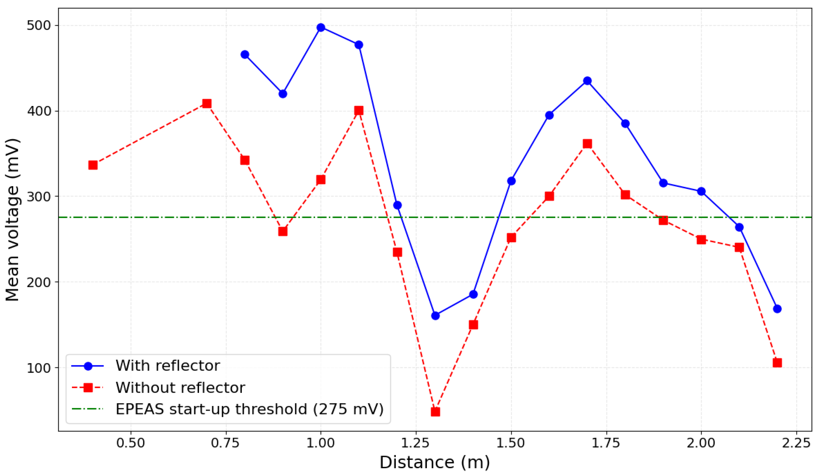 Figure 14. Mean DC output of rectenna vs. distance: with and without reflector (20 dBm).