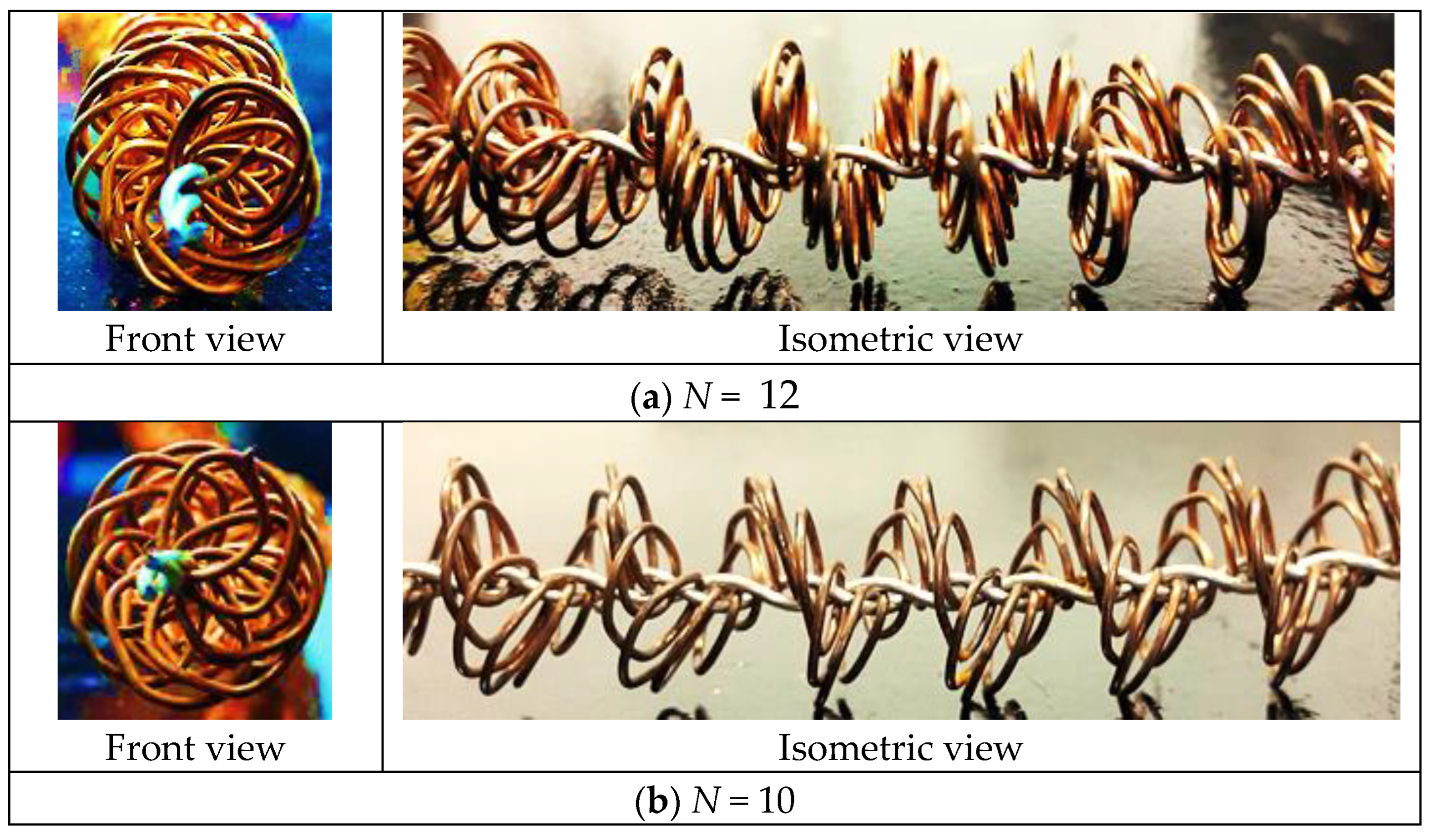 The knitted wire coil turbulators were made of 0.7 mm diameter copper wires wound around 1.0 mm diameter flexible core rods, as depicted in Figure 2 and Figure 3. Fabrication began by forming the copper wire into helical turns and inserting it into the gap between two twisted central core rods, shaping it into the desired looped or petal-like pattern. Prior to assembly, the wire positions were pre-marked using a circular template based on CAD design to guarantee uniform spacing and alignment. The wire loop density (N) was varied at 6, 8, 10, and 12 loops per pitch (1.0 pitch = 6.8 mm). For experimental analysis, the knitted wire coil turbulators were inserted into a 19 mm inner diameter heat exchanger tube, maintaining a constant 600 W/m2 wall heat flux.