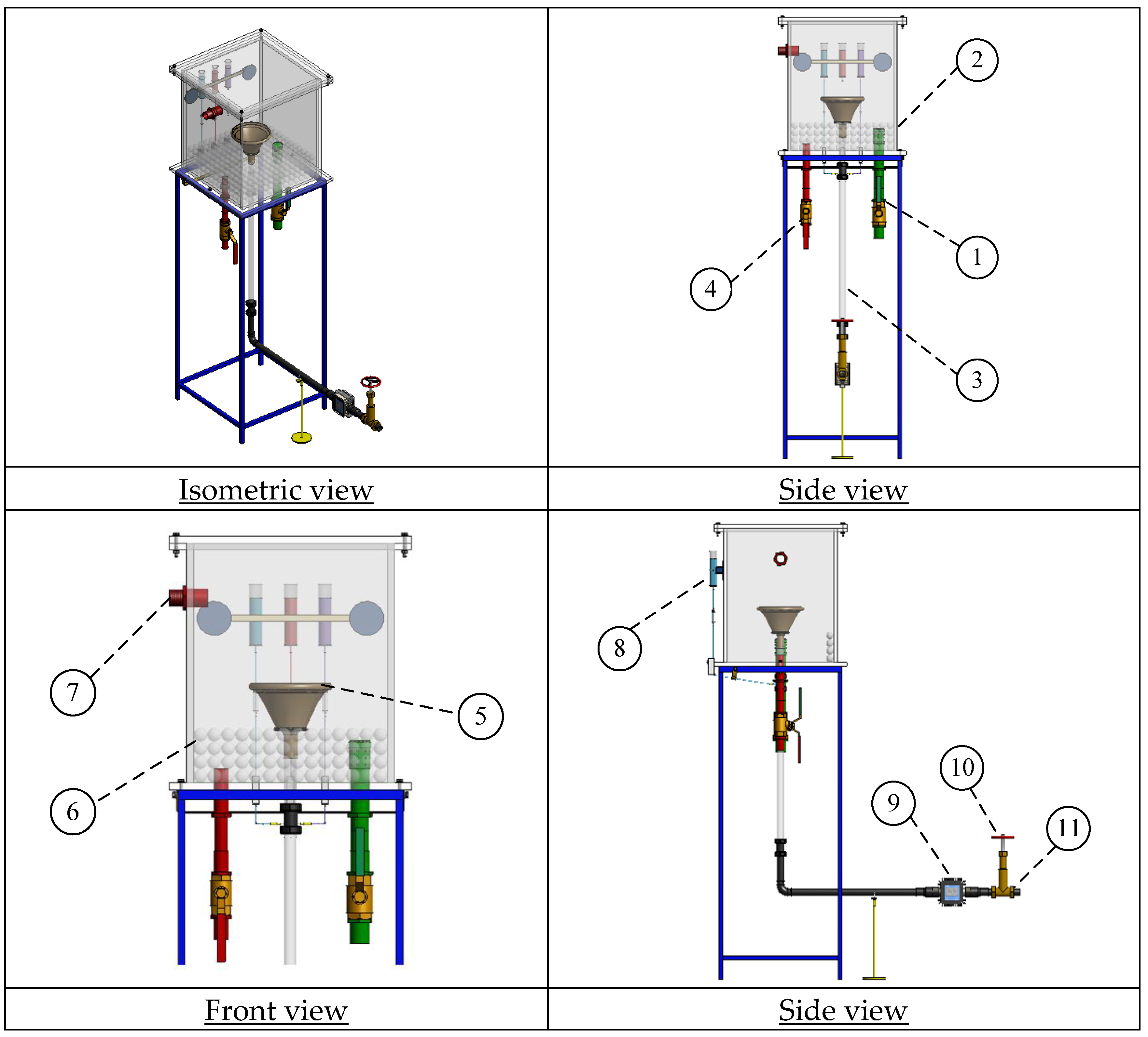 Figure 5. Details of the flow visualization apparatus: (1) inlet pipe, (2) over head pipe, (3) acrylic pipe, (4) outlet pipe, (5) bellmouth entry, (6) glass ball, (7) over flow pipe, (8) dye system, (9) flow meter, (10) control valve and (11) Exit tube.
