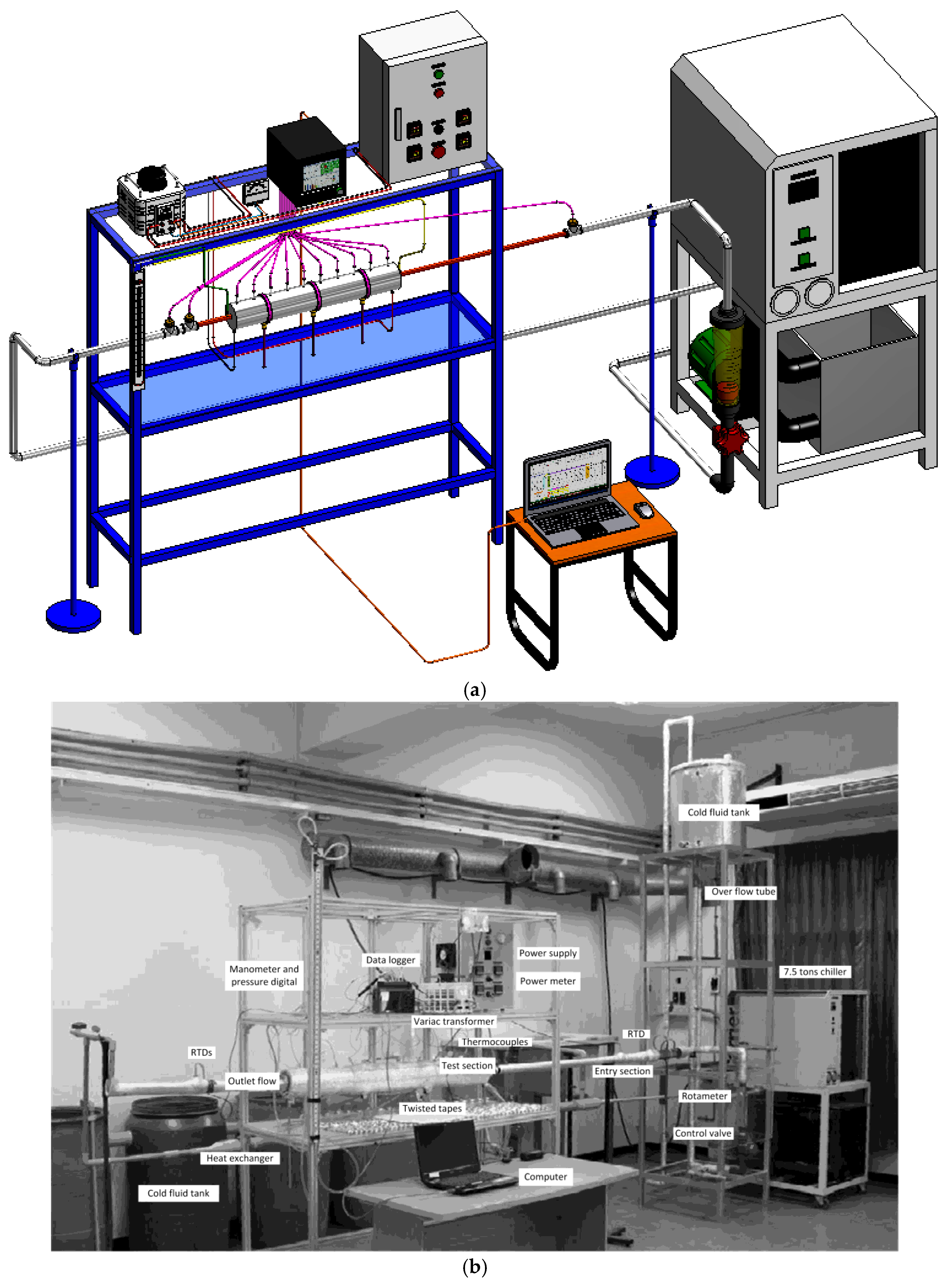 Figure 7. Details of the heat transfer apparatus: uniform heat flux tube, cooling tank, water pump, rotameter, T-type thermocouples, RTDs, data logger, controller box, Variac transformer, Watt meter, U-tube manometer and digital pressure manometer, and computer. (a) Heat transfer diagram setup. (b) Photograph of experimental setup. (c) Uniform heat flux tube fitted with thermocouples and a tube with a knitted wire coil turbulators inserted.