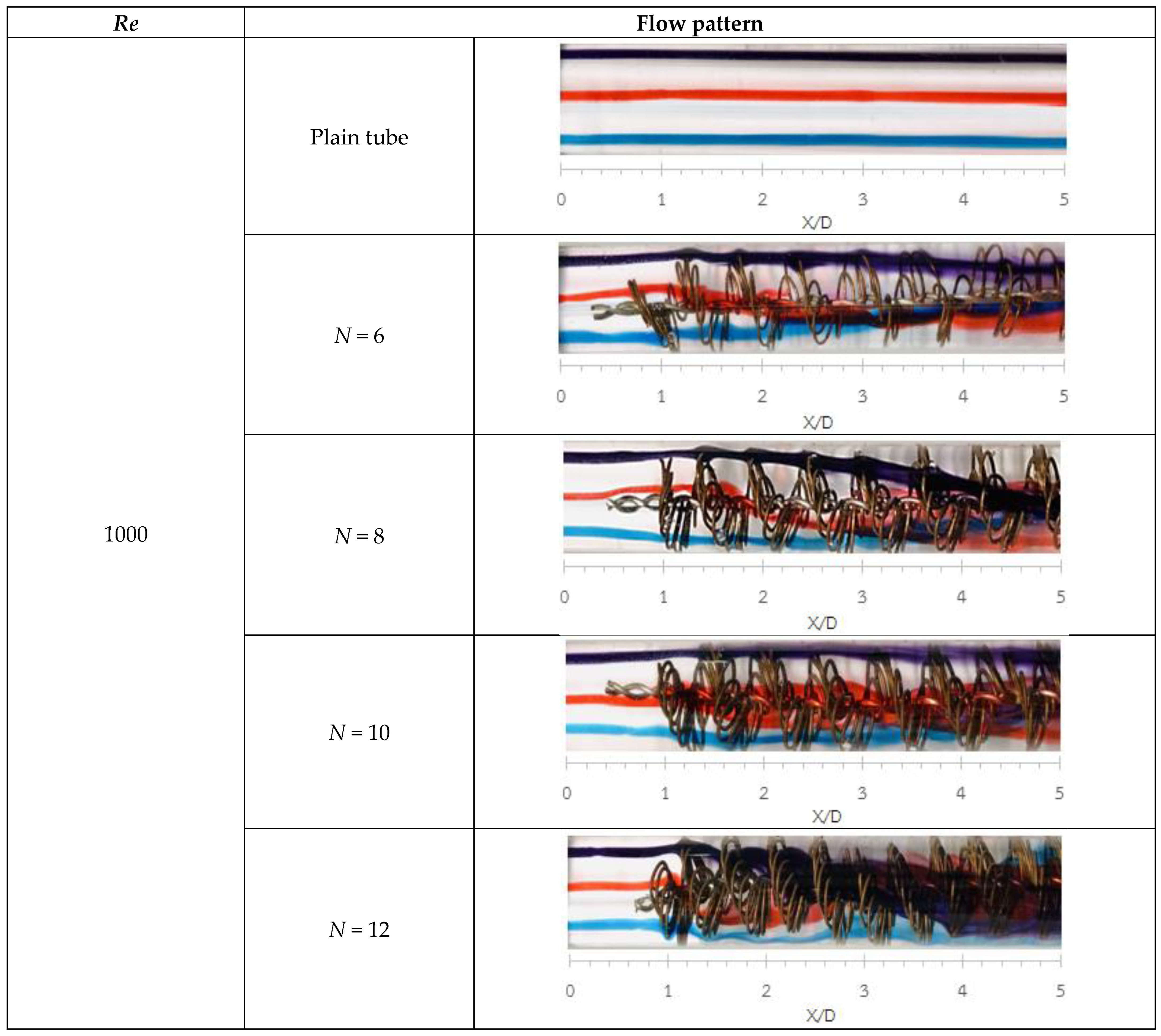 Figure 8b–d and Figure 9 illustrate the flow behavior in tubes equipped with knitted wire coil turbulators at wire loop number densities (N) of 6, 8, 10, and 12 loops. These experiments were conducted at Reynolds numbers of 1000, 2500, and 5000. The results indicate that flow characteristics varied based on the wire loop number density (N) and Reynolds number. At a Reynolds number of 1000 and N = 6, the dye streams showed only slight deviation from the main flow direction and remained relatively uniform within the range of X/D = 0.0–5.0. As N increased to 8 and 10, the dye streams exhibited greater deviation and dispersion; however, the original dye colors remained distinct with minimal mixing. When N was further increased to 12, the dye became noticeably dispersed within X/D = 1.0–3.0, and beyond X/D = 3.0, the colors gradually merged, forming new blended shades. At Re = 2500 and N = 6.0, the dye streaks began to disperse immediately upon impinging on the wire coil at X/D = 1.0, with clear mixing observed when X/D ≥ 3.0. Increasing N to 8 and 10 resulted in stronger dye dispersion and enhanced mixing, although the original color of the streaks could still be identified for X/D ≤ 2. When N = 12, intensive mixing occurred from X/D = 1.0, and beyond X/D = 2.0, the dye streams merged completely, producing distinct new color tones. At Re = 5000, the dye streams for all N values mixed almost instantaneously upon striking the wire coil at X/D = 1.0. The rate and intensity of color blending increased progressively with higher N, indicating stronger flow disturbance and enhanced mixing effectiveness.