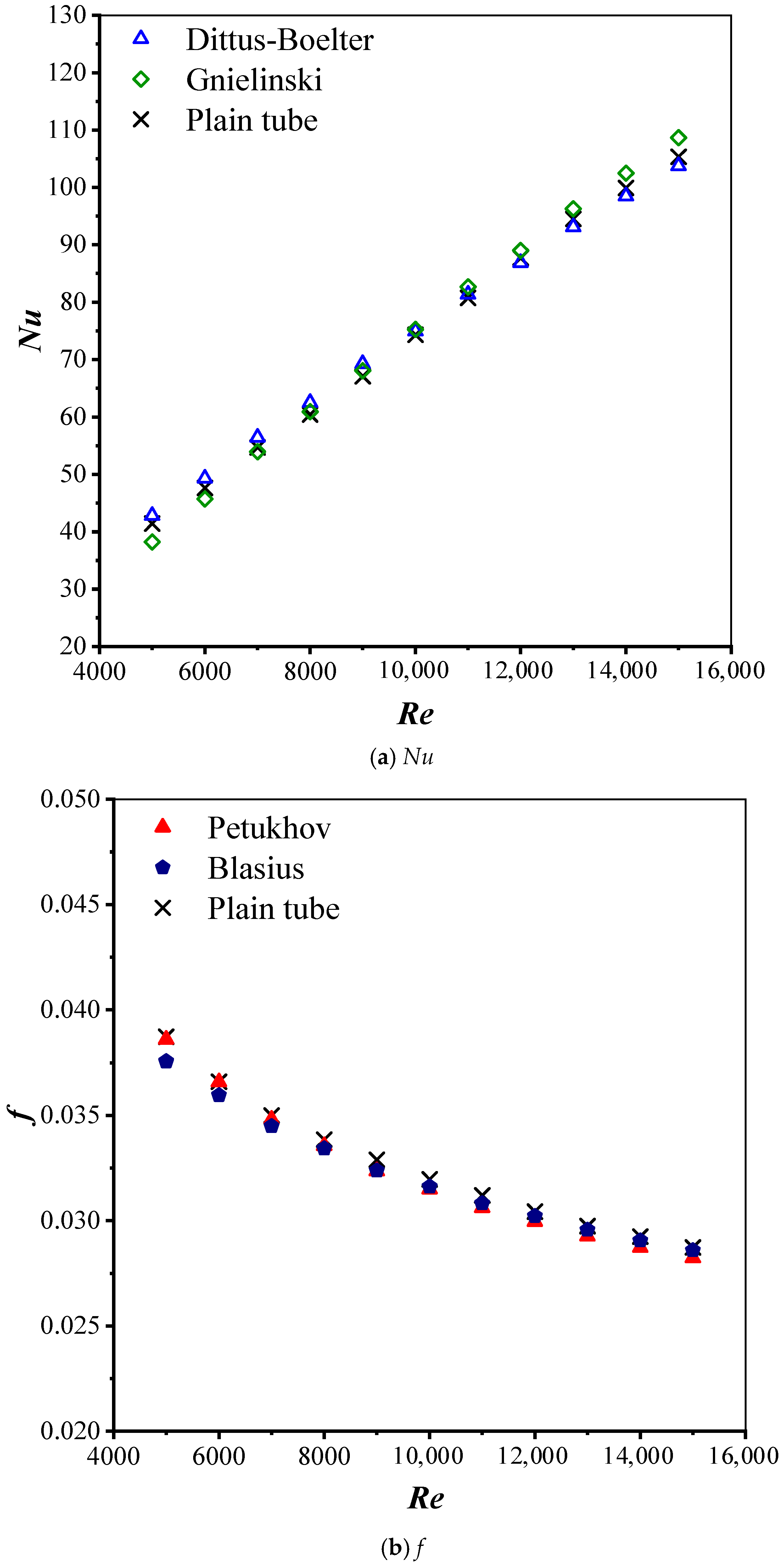 Figure 11. Validation test of the Nusselt number and friction factor of a plain tube.