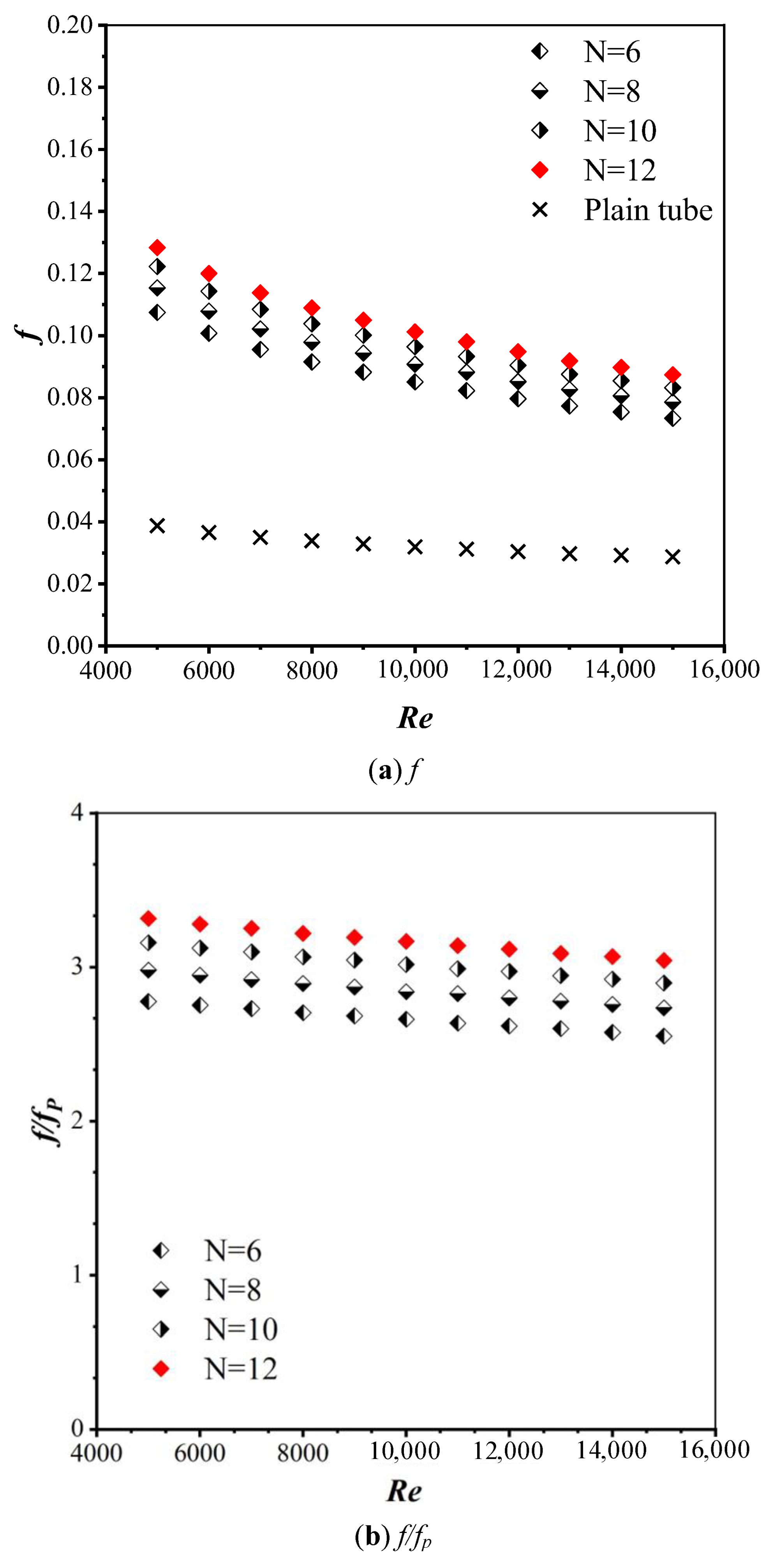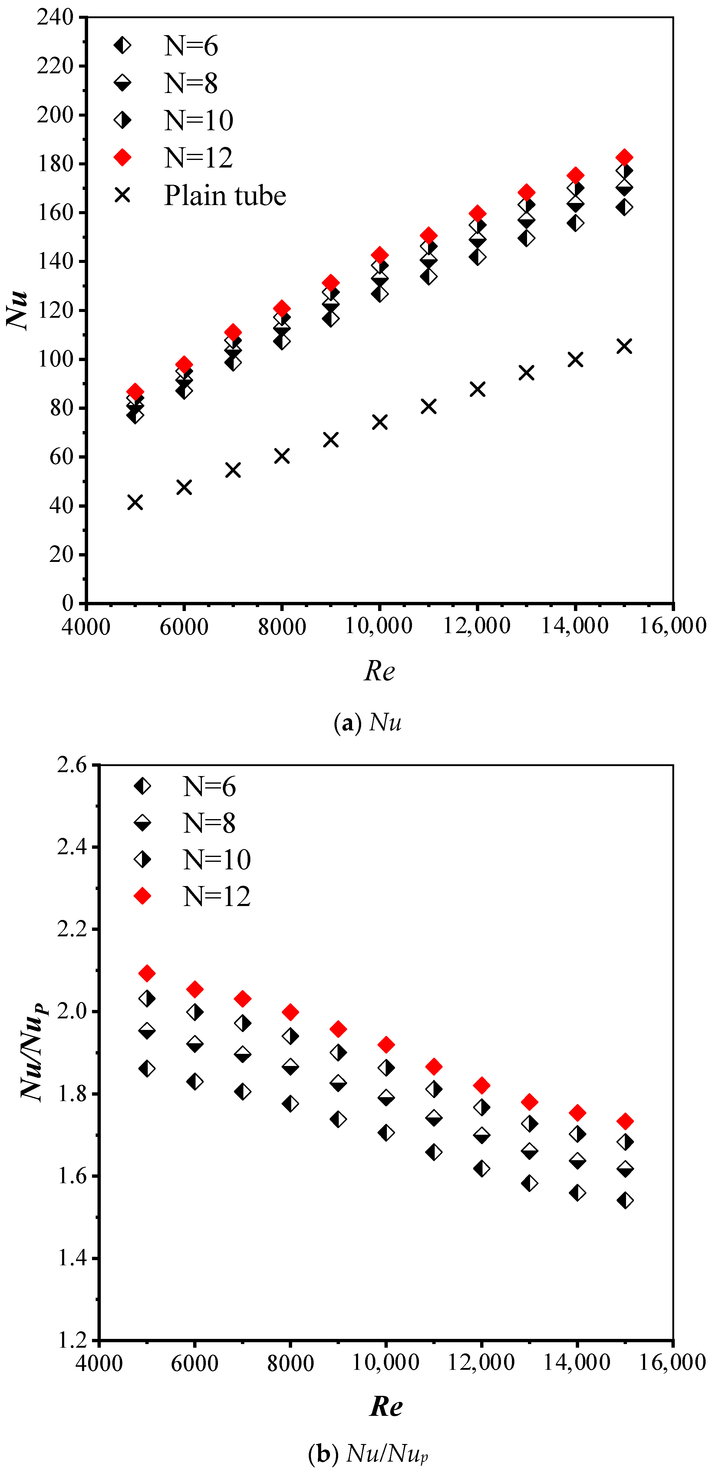 Uncertainty analysis was performed using the McClintock method [32]. The uncertainties for the dimensionless Nusselt number (Nu) and the friction factor (f) were estimated at ±4.1 and ±3.4%, respectively. Table 4 presents all measured parameters along with the uncertainty analysis results.