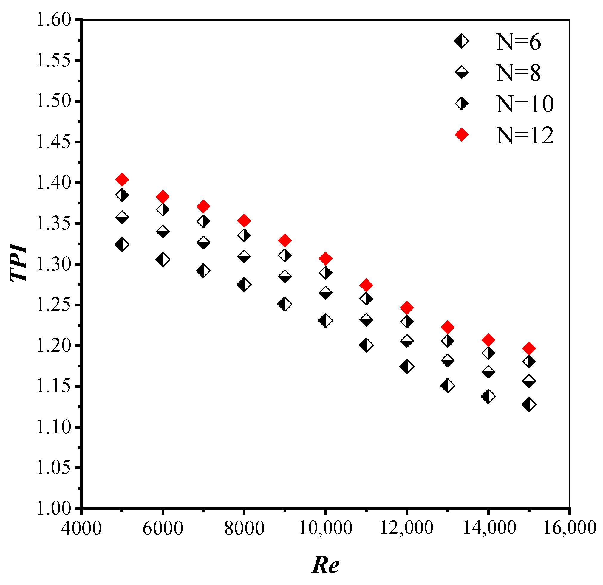 The thermal performance index (TPI) considers not only the increased heat transfer but also the pressure drop penalty when calculating the efficiency of techniques for enhancing heat transfer. It is useful for evaluating the overall efficiency of a heat transfer system as it quantifies the trade-off between thermal enhancement and increased flow resistance. A higher thermal performance index (TPI) shows that a strategy successfully balances better heat transfer and lower friction losses. The concept described in [31] is implemented to compute the thermal performance index (TPI) at a constant pumping power.