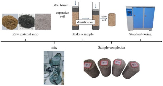 The soil improvement samples were prepared using different proportions of amendments, with the specific mixing ratios shown in Table 5. The sample preparation process is illustrated in Figure 3. Firstly, expansive soil, magnesium oxide, and coal gangue particles were accurately weighed according to the designated mix proportions and thoroughly mixed. The uniformly mixed improved soil was then poured into a mortar mixer, and water was added for mixing, with the water content controlled based on the optimum moisture content of the expansive soil. After mixing, the soil mixture was transferred into a molding mold to fabricate cylindrical specimens with a diameter of 50 mm and a height of 100 mm. The mold assembly consisted of a steel cylinder and steel end plates, and pressure was applied to the end plates to compact the soil into shape. Upon demolding, the specimens were carefully wrapped in plastic film to prevent moisture loss and subsequently placed in a standard curing chamber (temperature: 20 °C, relative humidity: 90%) for curing. After 28 days of curing, the specimens were removed for subsequent testing.