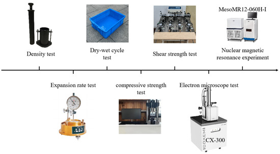 The testing procedure is shown in Figure 4. The uniformly mixed soil was placed into a light compaction apparatus to perform compaction tests, determining the maximum dry density and optimum moisture content of the improved soil under different mix proportions. For swell potential tests, specimens with a diameter of 61.8 mm and a height of 20 mm were used. These specimens were placed in a swell apparatus, which consisted of a consolidation ring, a displacement transducer, a lateral anti-swelling guide ring, and a water container, to measure the swell strain of the expansive soil upon immersion. During the wet–dry cycle tests, each cycle involved saturating the specimens by immersion for 24 h, followed by drying in a 40 °C environment until its mass stabilized (approximately 40 h). At the end of the 0, 1, 3, 5, 7, and 10th cycles, three unconfined compression test specimens and twelve direct shear test specimens were taken from each group, weighed, and their water contents determined before proceeding with the respective tests.