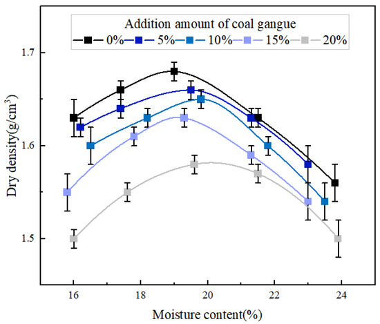 The compaction curves obtained with different coal gangue addition rates are shown in Figure 5. As the coal gangue content increased, the maximum dry density of the samples decreased from 1.68 g/cm3 in pure soil to 1.52 g/cm3 at the 20% coal gangue addition rate. This occurs because the particle size difference between the coal gangue and expansive soil particles is significant. At lower addition rates, larger coal gangue particles remain encapsulated within the expansive soil matrix, resulting in reduced overall density. However, as coal gangue content rises, its particles gradually interlock to form a skeletal structure. During this phase, the interlocking of larger coal gangue particles prevents the expansion soil particles from filling gaps between these skeletal contact points, leading to a more pronounced decrease in density.