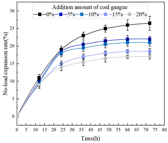 Figure 6 shows the unloading expansion rates of different coal gangue proportions. The results demonstrate that incorporating coal gangue effectively suppresses the unloading expansion rate of expansive soil. Within the 0–20% coal gangue range, higher additions resulted in lower stabilized rates. The unstabilized soil showed an unloading expansion rate of 25.9% after 60 h, while the stabilized soil with 20% coal gangue powder exhibited a rate of 18.05% after the same period, representing a 7.85% reduction. The unloading expansion rates remained stable at all tested proportions after 60 h, confirming successful completion of the trials. Notably, when coal gangue proportion exceeded 20%, the improvement became minimal with slight increases in rate, while the 20% addition achieved the lowest no-loading expansion rate.