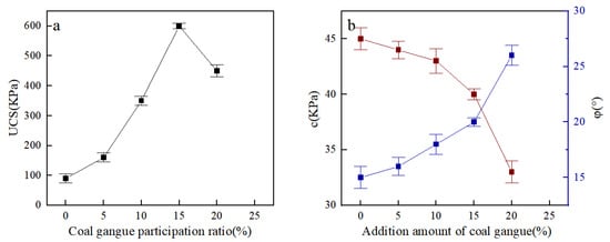 Relationship between coal gangue content and strength: (a) relationship between unconfined compressive strength and coal gangue content; (b) relationship between cohesion and coal gangue content in internal friction angle.