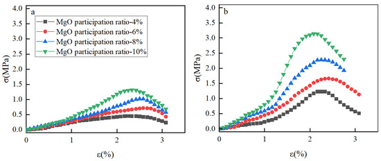 Stress–strain curves at different MgO levels: (a) the content of coal gangue is 0%; (b) the content of coal gangue is 15%.