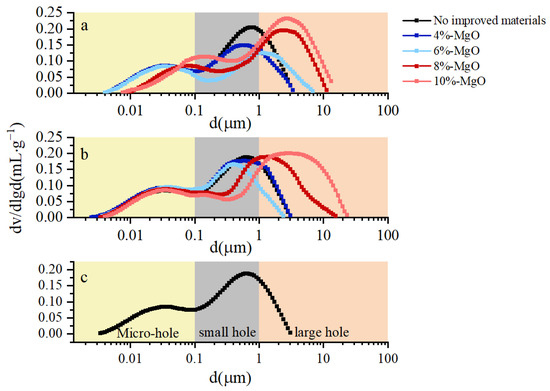 Pore size distribution curves: (a) composite improvement with coal gangue and MgO; (b) MgO improvement; (c) no improved materials.