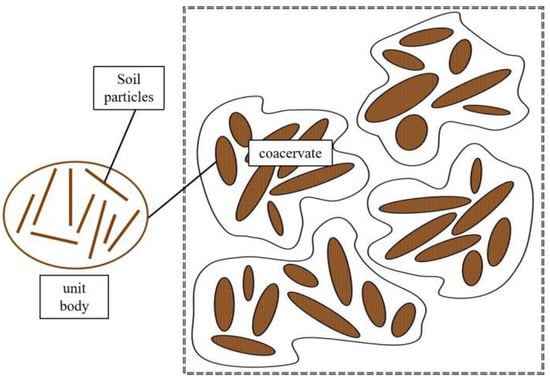 Through low-field nuclear magnetic resonance (LNR) analysis, T2 spectra of expansive soil samples were obtained. Based on Equation (2) and the T2 spectrum distribution, pore size distributions under different magnesium oxide addition levels were calculated. The dual-peak pore size distribution curve of this expansive soil is shown in Figure 10c. Typically, compacted expansive soil structures are shown in Figure 11: soil particles first form individual units through specific arrangements, which then aggregate into clusters. These clusters collectively constitute the macroscopic soil mass. Three types of pores exist in the soil structure—unit internal pores, cluster internal pores, and inter-cluster pores—classifying them as micropores, small pores, and macropores, respectively [27,32]. During preparation of stabilized expansive soil specimens, magnesium oxide is uniformly blended with the soil and mixed with water. Magnesium oxide tends to fill inter-cluster spaces. As it reacts with water and carbon dioxide to form binding materials, volume expansion occurs. However, since both individual units have low inherent strength and weak interconnections, the binding materials not only fill pores but also compress the soil particles within units, causing deformation and displacement of the structural units. When magnesium oxide was added to expansive soil, the pore size distribution curve of the samples exhibited distinct changes, as shown in Figure 10b. The addition of magnesium oxide caused varying degrees of alteration in micro-pores, small pores, and macropores. At 4% and 6% magnesium oxide content, the micro-pores remained relatively stable, while the porosity of small and macropores decreased significantly. With 8% and 10% magnesium oxide content, the micro-pores showed minimal change, but the macropore porosity increased markedly. This demonstrates that low magnesium oxide concentrations effectively filled interparticle voids and enhanced soil compaction. However, when the magnesium oxide content reached 8%, volume expansion from water absorption and its reaction with carbon dioxide to form basic magnesium carbonate disrupted the particle structure, causing internal microcracks. The expansive soil particles exhibited a narrow size range, with most having a particle size around 0.02mm. This limited particle span results in slight irregularities in cementitious materials produced by magnesium oxide carbonization. Variations in reaction rates and spatial distribution of these materials may lead to the misalignment of pore structures, ultimately altering porosity characteristics.