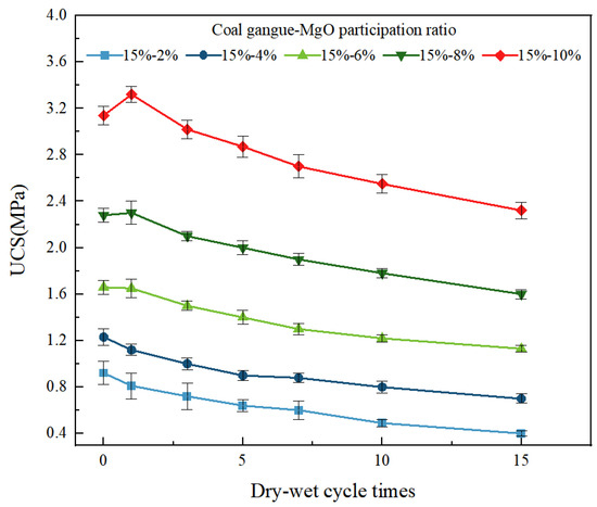 Figure 12 illustrates the relationship between the unconfined compressive strength (UCS) of composite-stabilized samples and the number of wet–dry cycles. As the number of cycles increased, UCS gradually decreased. The trend analysis reveals three distinct phases: In the initial cycles, samples with lower MgO content initially showed reduced UCS, while those with higher MgO content demonstrated enhanced strength. Specifically, the 15% coal gangue–10%MgO mixture exhibited an approximately 5% strength gain. This occurred because residual MgO and coal gangue components remained reactive during curing. During subsequent cycles, periodic moisture changes and temperature increases caused continuous reactions of carbonate and aluminate active substances in coal gangue, mitigating the deterioration effects of wet–dry cycles. This led to a phenomenon known as autogenous healing, which resulted in minimal strength loss or even a slight strength gain. Conversely, samples with 10%MgO alone experienced a 22% decrease from 1.43 MPa to 0.93 MPa after one cycle, with continued decline thereafter. As cycles progressed, the remaining active substances in coal gangue became exhausted, leading to more pronounced deterioration effects. By the third cycle, UCS across all MgO levels showed significant reduction with increasing cycles. In the third stage, the reduction rate of unconfined compressive strength slowed down with the progression of dry and wet cycles. At this time, the internal structure of the sample gradually stabilized, the sensitivity decreased, and the deterioration effect of dry and wet cycles on the internal structure gradually weakened.