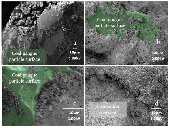 During the initial mixing of coal gangue with expansive soil, ion exchange and agglomeration occur. The presence of high-valent cations, like Ca2+ and Mg2+, in coal gangue triggers an ion exchange process with low-valent cations, such as K+ and Na+, on soil surfaces [36,37]. This exchange between high-valent and low-valent cations on clay particles reduces the thickness of water films adsorbed by soil particles. The resulting ion exchange process decreases active substances in the soil, thereby enhancing its stability [38]. Figure 13a shows the microscopic state of coal gangue surfaces without bound materials, appearing relatively smooth. Figure 13b illustrates the reaction between active substances in coal gangue and those in MgO and expansive soil, resulting in surface adhesion. It can be observed that MgO hydration products encapsulate and adhere to coal gangue particles, creating interconnections between coal gangue and soil particles through the formation of bound materials. Figure 13c,d reveal cracks and pores at the interface between cemented materials and coal gangue particles. These microcracks arise from asynchronous ion reactions during curing and moisture cycles, as well as the carbonation process of MgO. The volume instability of MgO hydration products subsequently generates splitting forces within pre-formed bound materials, leading to microcrack development in MgO-stabilized soil matrix. The formation of these microcracks affects the overall strength, durability, and performance of MgO–soil mixtures. The framework structure formed by coal gangue, combined with its reactive components, expansive soil, and cementitious products generated through reactions with MgO, creates a network-like configuration. The alteration structures induced by the incorporation of coal gangue and MgO reduce the contact probability between expansive soil particles and water. This diminished interaction enhances soil strength and water stability. By minimizing particle–water contact, the system effectively reduces both quantitative variations and water-induced swelling potential, thereby improving overall soil stability and structural integrity.