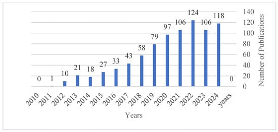 Annual number of peer-reviewed publications on smart warehouse systems (2010–2024), based on Web of Science data.