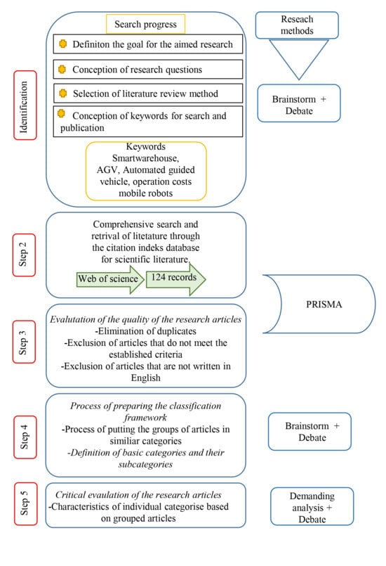An examination protocol is developed internally for the search strategy, eligibility criteria, data extraction, and synthesis methods. No deviations from the planned methodology occurred. According to the research presented in [18], this method is considered extremely effective in observing and investigating the level of knowledge and degree of development of scientific conclusions on the integration of modern technologies into smart warehouses. Many scientists use this method to identify, collect and classify similar research (see, for example, [19,22]). This research and the procedure itself will detect all empirical evidence that meets the pre-set inclusion criteria in order to answer the research questions [23]. The research process comprises five steps. This is illustrated in Figure 2.