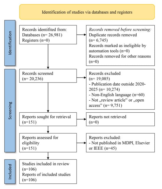 - Study designs: peer-reviewed primary research, technical papers, and reviews published in English (2020–2025).