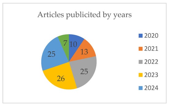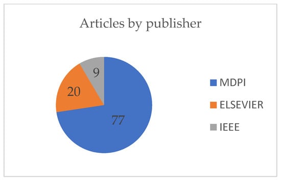 Figure 6 shows the number of articles published by MDPI, Elsevier and IEEE. MDPI is the publisher with the most articles, with 71 publications. This is entirely understandable, given that this publishing house is one of the most renowned for publications on innovative technologies and engineering solutions. Second place went to the Elsevier publishing house, with a total of 20 publications—25.97% of MDPI’s total. Elsevier also has numerous articles concerning contemporary technologies and their application in technical systems. These two publishing houses have received positive feedback from scientists because they can publish articles very quickly. The IEEE is a publishing house with nine published articles, accounting for 11.68% of MDPI’s total. This study only examined review and open access papers to gain a better understanding and enable full access to papers without paying expensive fees.