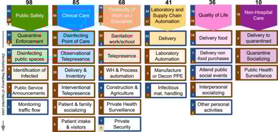 A display of 203 examples of robot use for COVID-19 applications (brown-ground and blue-aerial robots) by [26].