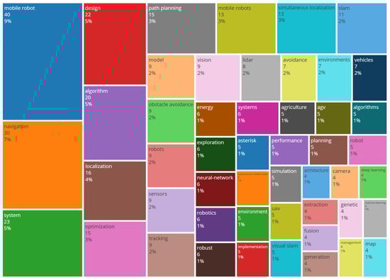 The bibliometric analysis of the 106 included studies, conducted using the AI-powered tool Bibliometrix, reveals a clear hierarchy of thematic focus, with “mobile robot” emerging as the most frequently occurring keyword (40 occurrences), underscoring its centrality to the research domain. Keywords such as “navigation” (30 occurrences) and “system” (23 occurrences) further delineate the core technical challenges addressed in contemporary literature, reflecting an emphasis on operational frameworks and spatial autonomy. The co-occurrence of terms like “algorithm,” “path planning,” and “simultaneous localization” highlights the methodological convergence toward computational intelligence for enabling precise and adaptive robotic behavior in dynamic warehouse environments (Figure 7).