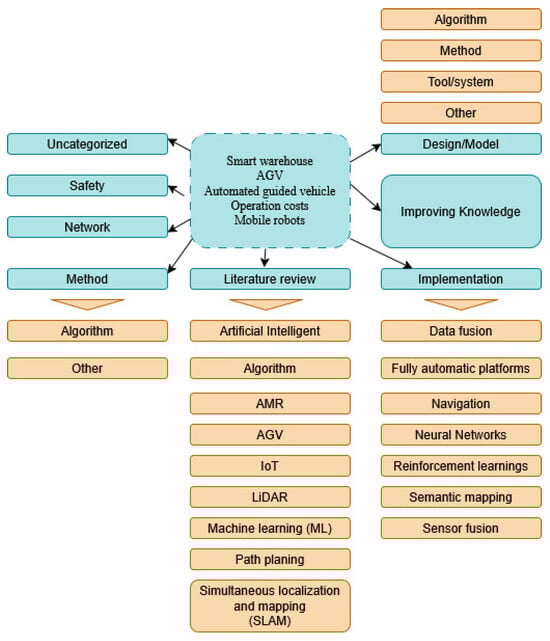 A systematic review of articles was conducted to identify the most frequently utilized keywords [7,9,25], which recognized the expressions most relevant to smart warehouses integrated with automated guided vehicles and mobile robots. The search strategy combined keywords related to setting (“smart warehouse*”, “automated warehouse*”, “logistic* center”), technology (“AGV”, “automated guided vehicle*”, “AMR”, “autonomous mobile robot*”, “mobile robot*”), methods (“AI”, “artificial intelligence”, “SLAM”, “sensor fusion”, “LiDAR”, “reinforcement learning”, “semantic mapping”), and outcomes (“cost”, “navigation”, “safety”, “path planning”, “efficiency”).