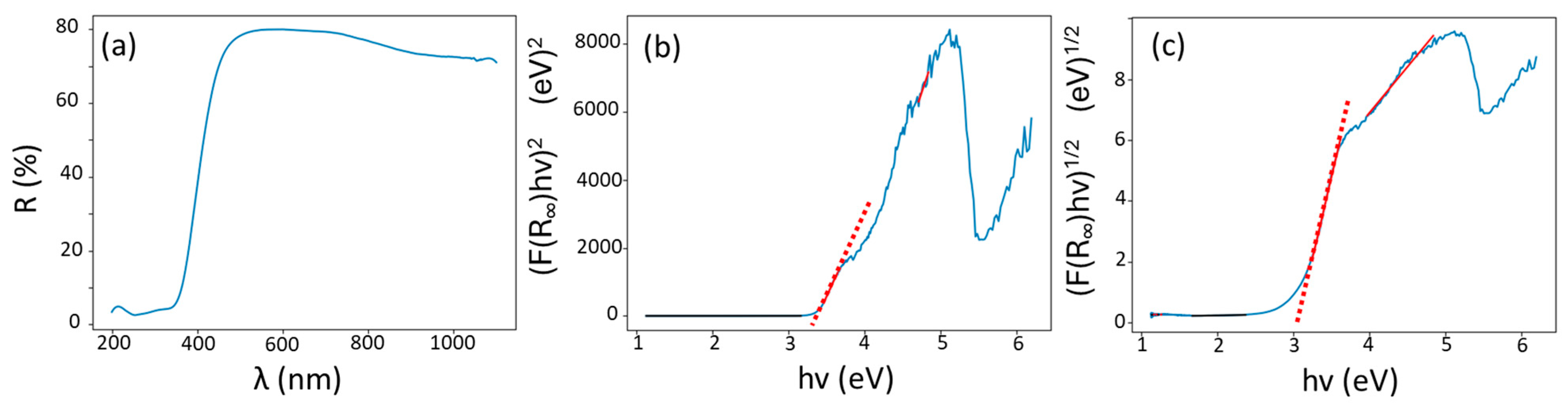 The band gap energies of the UV-Vis spectra datasets were estimated using the K–M transformation [18,29] in combination with the Tauc method [41,42]. The relationship between the transformed reflectance and the photon energy is expressed as the following: