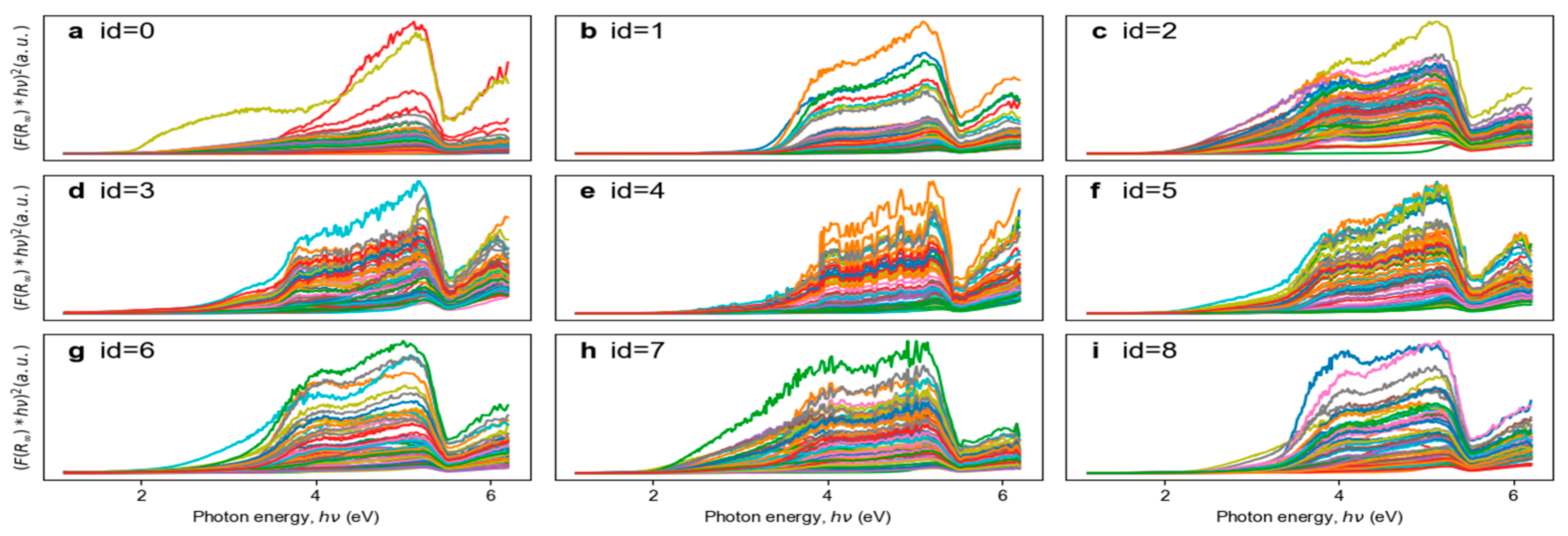 High-entropy oxides (HEOs), first introduced by Rost et al., represent a notable extension of this multicomponent materials class [4]. Since 2016, numerous studies have reported advances in various synthesis methods [31,32,33], structural characterizations [34,35,36,37], and potential applications of HEOs [38,39,40]. Deviations from near-equiatomic compositions have motivated combinatorial studies, for which high-throughput synthesis and characterization techniques have become key enablers to navigate the complex compositional space. The UV-Vis spectroscopy, a widely used technique to determine the optical band gap, plays an important role in the HEO studies [18,29]. The diffuse reflectance spectroscopy (DRS) combined with the UV-Vis spectrophotometry provides valuable insight into the optical properties of HEOs, but the analysis of large datasets demands automation. The interpretation of DRS data typically relies on the Kubelka–Munk (K–M) model, which allows the estimation of the optical band gap (Eg) from transformed reflectance spectra. As outlined in previous studies, the method requires both a clear understanding of the model and careful sample preparation [41,42]. Convetionally, Eg is obtained by plotting the transformed spectra by the K–M model and extrapolating the linear portion of the curve to the photon energy axis—a procedure that is manageable for a few samples but becomes impractical for large high throughput (HT) datasets. A detailed explanation is offered in the methodology section [42,43,44].
