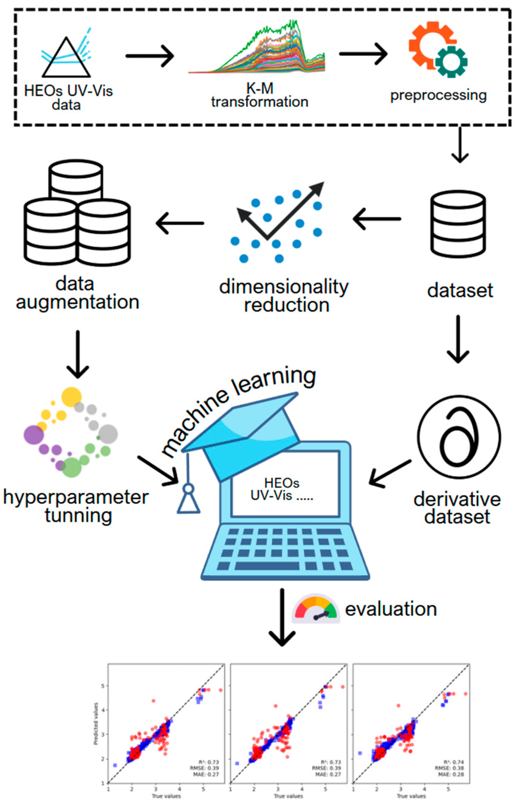 The methodology employed in this study is based on datasets obtained from previous publications by our research group [18,29]. These datasets were selected to ensure comparable synthesis conditions achieved through the HT experiments and to provide sufficient chemical diversity arising from the combinatorial synthesis of multiple elements. The overall experimental workflow comprises three main stages: data preprocessing, data augmentation, and machine learning-based prediction of band gap energy from the UV-Vis spectroscopy data. In the preprocessing stage, raw spectral data were cleaned, normalized, and transformed to remove noise and prepare the input features for ML modeling. Subsequently, synthetic data were generated through data augmentation to improve model generalization and robustness. Finally, various ML algorithms were applied to establish accurate relationships between the processed UV-Vis spectra and the corresponding band gap energies of HEOs.