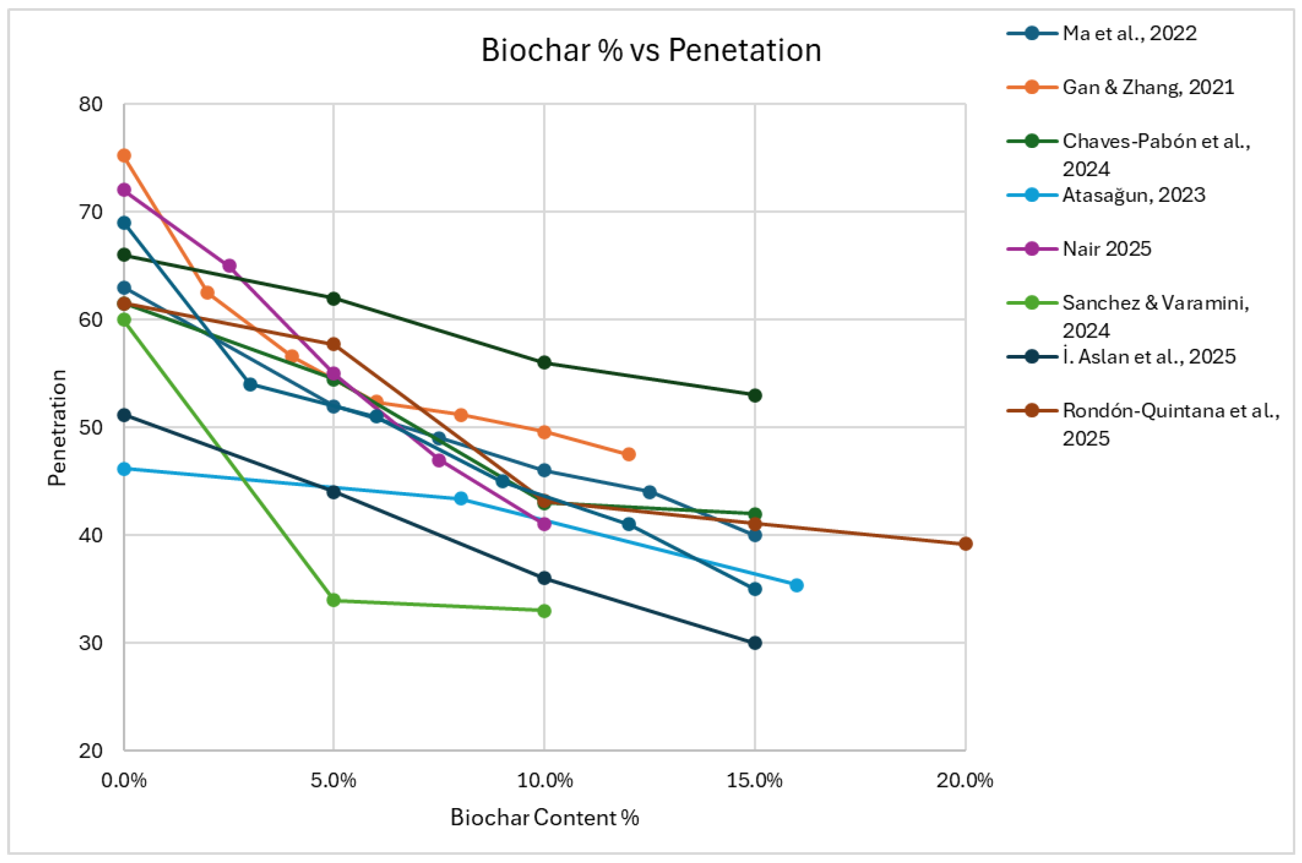 | [61] | Biochar from landscape conservation and gardening of wood waste. | Marshall test, semi-circular bending (SCB) test, Uniaxial cyclic compression test, indirect tensile strength test |