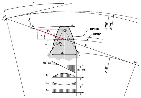 The model applied in the present research differs in that force application point is not at the edge of the tooth head, but at the interface of the individual tooth contact as shown in Figure 2. Consequently, is not necessary to calculate the exact number of mating teeth coefficient separately and the value of the tooth factor is determined by measurement in a CAD system. Thanks to the measurements, the value of the tooth factor can be determined for both the pulled and the compressed side of the tooth, so that asymmetric tooth structures can be tested. The circular arc Highest Point of Single Tooth Contact (HPSTC) in Figure 2 indicates the starting point of the single tooth contact, while Lowest Point of Single Tooth Contact (LPSTC) indicates the end point.