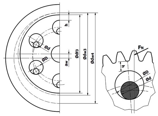 The validation of the tooth root stresses was performed by analytical and FEM simulations. As a result of the research, the design of the guiding holes and the wheel relief holes can be performed with an accurate knowledge of their influence on tooth stress. The overall objective of this paper was to find a method to calculate the maximum guiding hole pitch diameter at which the stress does not increase in the tooth root. The first step in the calculation algorithm is to determine the necessary gear parameters based on the gear ratio and the performance of the planetary gear. The number of teeth and the module “m” can be determined. This also gives the center distance “a”. Knowing the torque of the planetary gear, the diameters of the drive pins must be determined by strength calculations. The diameter of the guiding holes “D” is the sum of the diameter of the drive pin and twice the center distance. Based on the relationships presented in the article, it is possible to determine the maximum guiding hole pitch diameter at which the stress does not increase in the tooth root. Future work should include examining the effect of the wheel width-to-diameter ratio. These calculations were based on the assumption that, during the design process, the tooth stress value is kept constant by selecting the required wheel width.