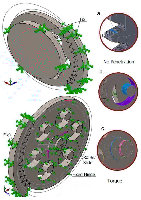 Boundary conditions for finite element analysis; (a) tooth contact, (b) driving or guiding contact with the planetary gear, (c) load torque entering the eccentric axis.