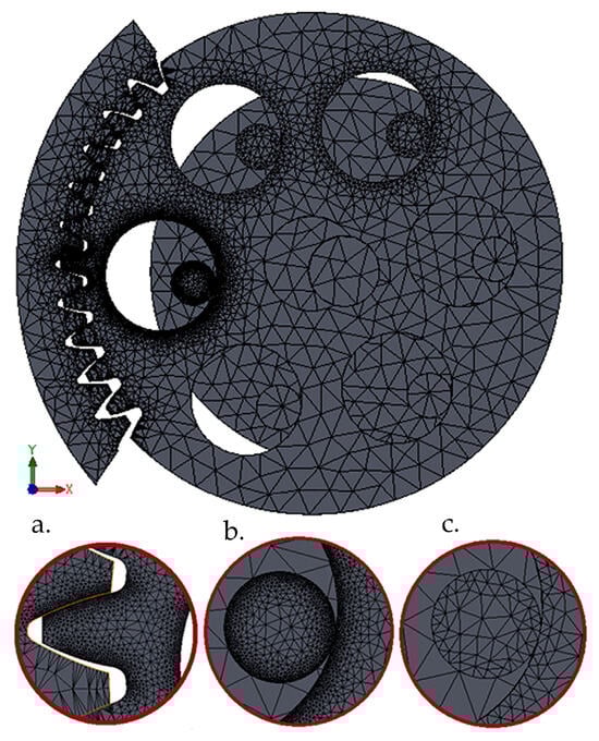 The Curvatured Mesh Elements model. (a) loaded tooth pair, (b) guiding hole and pin weakening the loaded tooth pair, and (c) pins involved in load transfer.